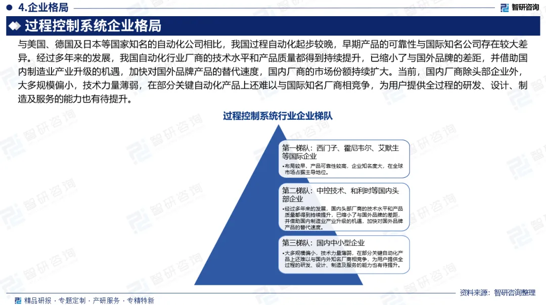 企业格局:与美国、德国及日本等国家知名的自动化公司相比,我国过程自动化起步较晚,早期产品的可靠性与国际知名公司存在较大差异。经过多年来的发展,中控技术、和利时等国内自动化厂商的技术水平和产品质量都得到持续提升,已缩小了与国外品牌的差距,并借助国内制造业产业升级的机遇,加快对国外品牌产品的替代速度。