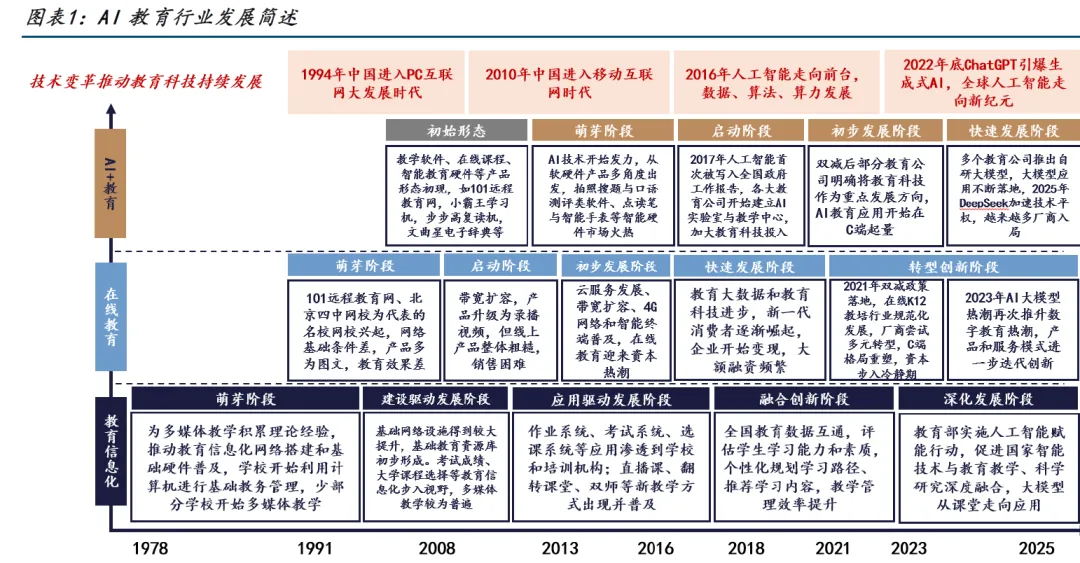 AI教育主要依托于教育信息化和在线教育发展。我国教育体系主要分为校内学历教育和校外非学历培训,过去数十年,校内教育向教育信息化发展,而校外教育主要向在线化发展,基础设施完善、教育数据资源增长、在线教育渗透率提升为AI教育发展奠定坚实基础。校内方面,2000-2016年是我国教育信息化1.0时期,这一阶段基本完成了全国中小学互联网和多媒体教室的普及,2018年我国教育信息化进入2.0阶段,优质数字教育资源不断增加,以AI智慧课堂为代表的智能化产品开始辅助校内教学。校外方面,2013年以来随着云服务发展、带宽扩容、4G网络和智能终端普及,在线教育步入产业化,学科教育、素质教育、软硬件产品百花齐放,2020年公共卫生事件催化下在线教育渗透率提升到20%以上,这些均为AI教育发展提供土壤。