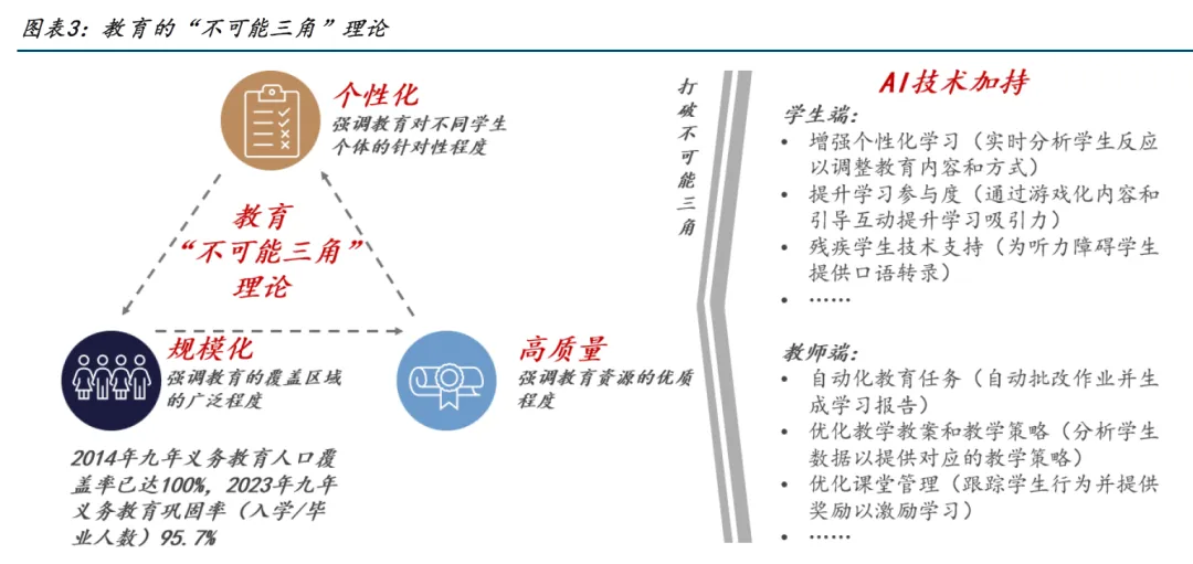 AI赋能有望助力实现规模化、高质量、个性化的教育。传统的教育面临"不可能三角"挑战,即同时实现规模化、高质量、个性化。新中国成立后,我国逐渐普及了义务教育,解决了教育有无的问题,但是不同地区、城乡和学校之间教育水平仍然存在客观差距,并且个性化的因材施教(充分了解学生,针对学生不擅长的领域进行教学和练习,提高学习效率、减轻学习负担)难以普及。然而,AI大模型的出现有望打破这一不可能三角。AI技术加持下,教师能够快速收集到更优质的教学资源、进行更高效的教研、优化针对不同学生的教学策略等,学生能够接收更个性化的学习内容、对感兴趣的跨学科内容主动探索。同时,基于AI的平台可以处理大量数据,能够为越来越多的学生提供个性化学习体验,而不影响质量。