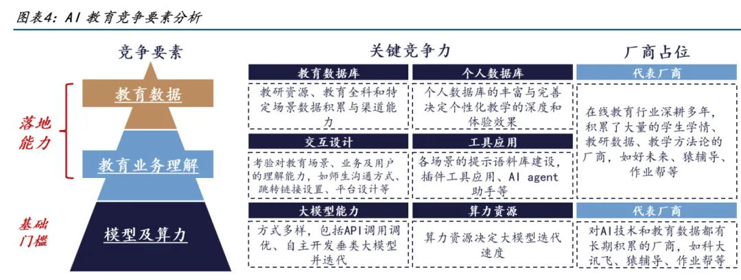 AI教育产品的关键要素主要体现为模型及算力、教育业务理解、教育数据三方面。其中,模型及算力是基础门槛,目前主要有API调用调优、自主开发大模型,以及两者结合三种方式来获取底层的模型及算力能力。教育业务理解和教育数据决定企业是否有落地能力,以及是否能够达成好的用户体验和学习效果,这里涉及产品设计逻辑、用户痛点感知、语料库和工具建设等方面,以及利用大量优质的教研数据资源、学生学情数据资源等反哺大模型迭代优化,要求企业在教育业务和互联网产品(或硬件产品)上具备深入理解。