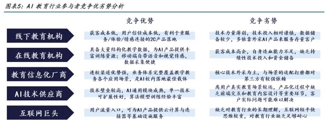 AI教育的参与者可分为"教育系"、"技术系"两派。"教育系"包括具备教育业务经验背景的线下和在线教育机构,他们的共同点在于对教育业务具备深刻的理解,其中头部企业发展至今已经形成了较为丰富的教育产品矩阵,构成生态圈,其中线下教育机构获客成本低、用户信任度高,有利于重服务/体验/情感连接的C端AI产品落地,但是技术力量相对薄弱;线上教育机构具备大量结构化的教学数据作为训练资源,但是自身获客成本高、造血能力不足,在持续性技术投入上存在不确定性。"技术系"包括AI技术供应商和互联网巨头,这两类玩家存在重合,其优势在于技术壁垒高、AI模块成熟、模型算法训练经验丰富,拥有庞大的流量入口,且能够提供云计算等基础设施,但是缺乏对教育行业的长期理解,产品化输出可能难以满足教育真实需求。教育信息化厂商综合了"教育系"和"技术系",具备较强的进校优势,但是核心技术以外采为主,对第三方依赖重。
