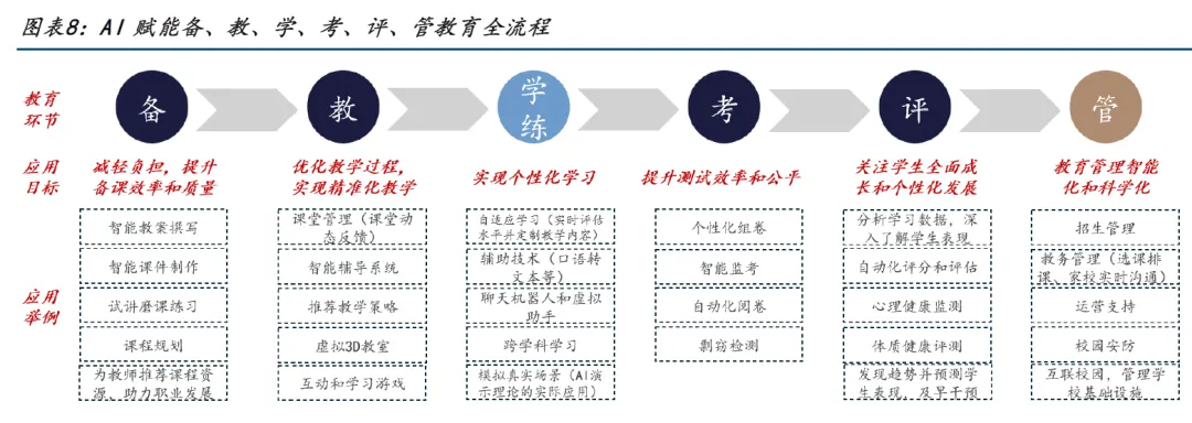 AI对教育的赋能可作用于备课-教学一学练考试-评价一管理全教育流程。1)备课、教学、评价主要由教师执行,目前教师的工作内容普遍较为繁琐,AI能够帮助教师提供更适合的课程规划、辅助教案和课件撰写、通过分析学生反馈进行课堂管理、自动化评分和评估等,能够通过虚拟3D教室等方式提升学习互动体验,优化教学过程。2)管理主要由教务人员进行,AI能够帮助优化课程、预算等资源配置,实时更新学生进度和课堂活动、推动家校无缝沟通等。3)学练、考试主要由学生进行,由于学生个体差异大,核心需求是自适应,实现个性化学习,AI能够实时评估学生水平,并提供定制的教学内容以满足个体需求,且根据学生反应动态调整课程,帮助学生按自身的学习节奏掌握知识。