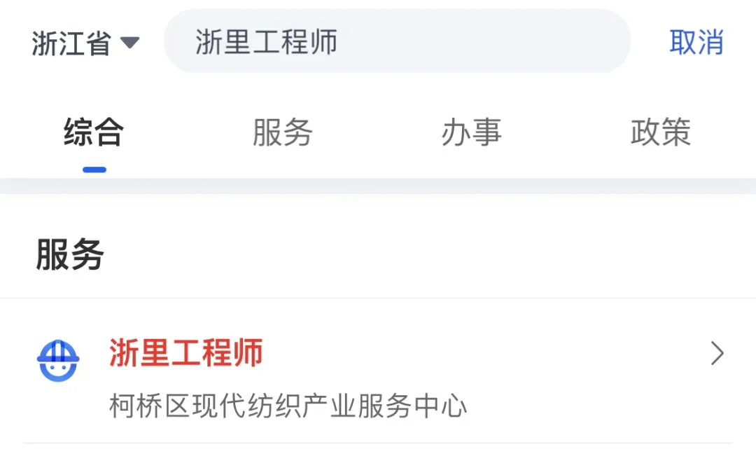 2、搜索框输入“浙里工程师”,并进入对应服务首页;