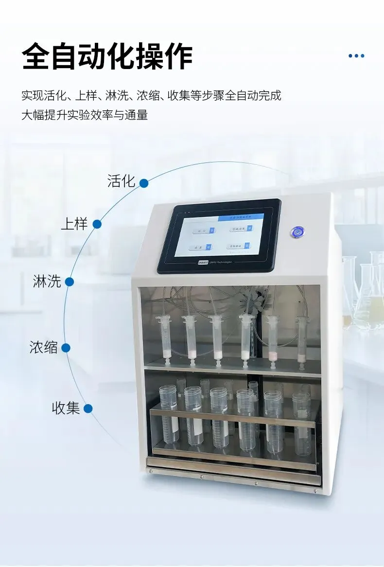 该全自动固相萃取仪可实现从活化、上样、淋洗、收集整个固相萃取过程的全自动化操作,无需人工干预,同时集成快速浓缩功能,进一步缩短样品前处理周期,大幅提高工作效率,适用于各类样品的批量前处理。