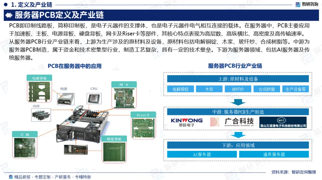 产业链:从服务器PCB行业产业链来看,上游为生产涉及的原材料及设备,原材料包括电解铜锭、木浆、玻纤纱、合成树脂等。中游为AI服务器PCB制造,属于资金和技术密集型行业,制造工艺复杂,具有一定的技术壁垒。下游为服务器领域,包括AI服务器及传统服务器。