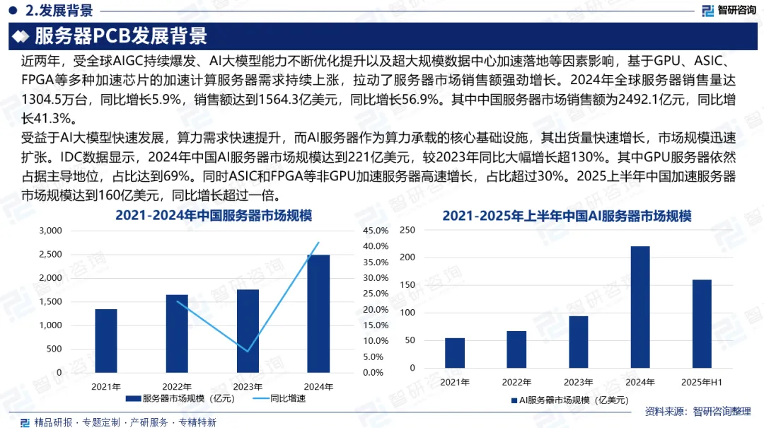 发展背景:近两年,受全球AIGC持续爆发、AI大模型能力不断优化提升以及超大规模数据中心加速落地等因素影响,基于GPU、ASIC、FPGA等多种加速芯片的加速计算服务器需求持续上涨,拉动了服务器市场销售额强劲增长。2024年全球服务器销售额达到1564.3亿美元,同比增长56.9%。其中中国服务器市场销售额为2492.1亿元,同比增长41.3%。