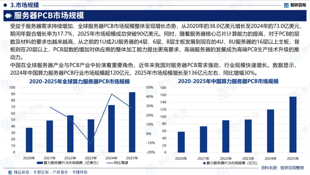 中国市场规模:中国在全球服务器产业与PCB产业中扮演着重要角色,近年来我国对服务器PCB需求强劲,行业规模快速增长。数据显示,2024年中国算力服务器PCB行业市场规模超120亿元,2025年市场规模增长至136亿元左右,同比增幅30%。