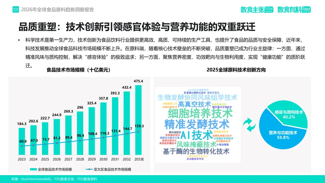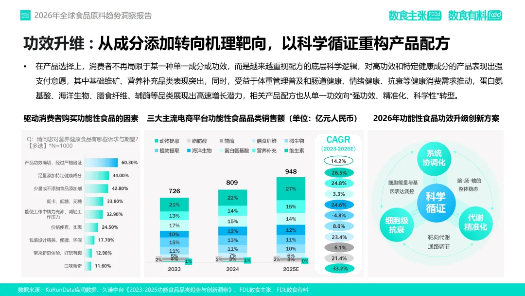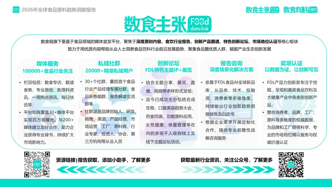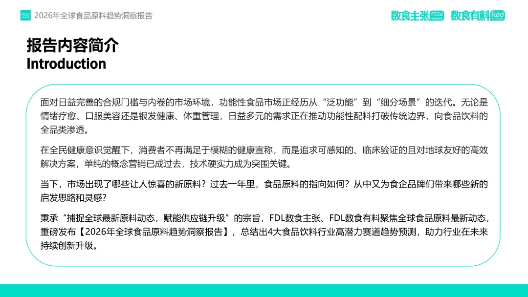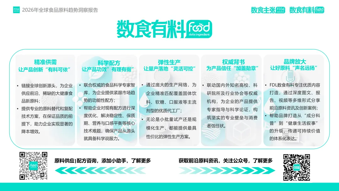 在这一趋势驱动下,FDL数食主张与FDL数食有料联合发布《2026年全球食品原料趋势洞察报告》,基于对2025年全球98家企业、128款新原料的深度分析,提出四大核心趋势:功效升维、人群细化、品质重塑与信任构建。本报告旨在为行业从业者提供前沿洞察,赋能供应链创新与产品升级,助力企业在合规趋严、竞争加剧的市场中构建差异化竞争力。