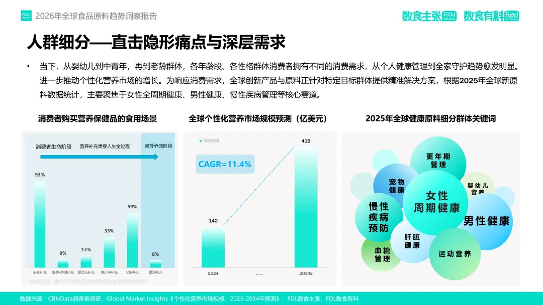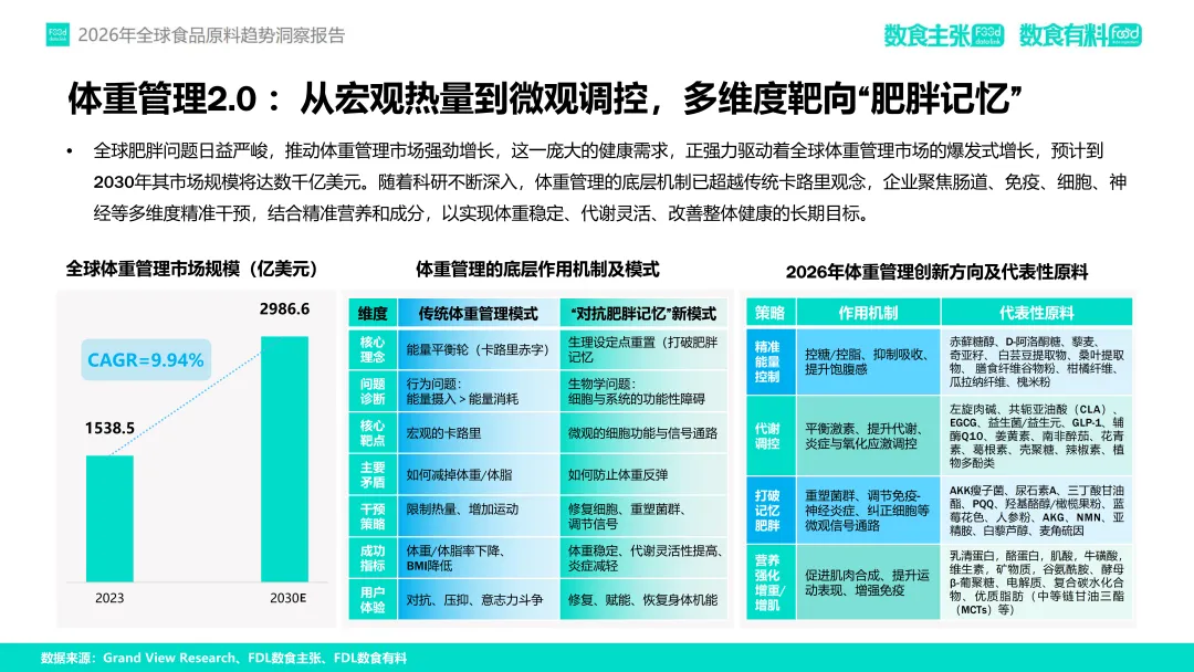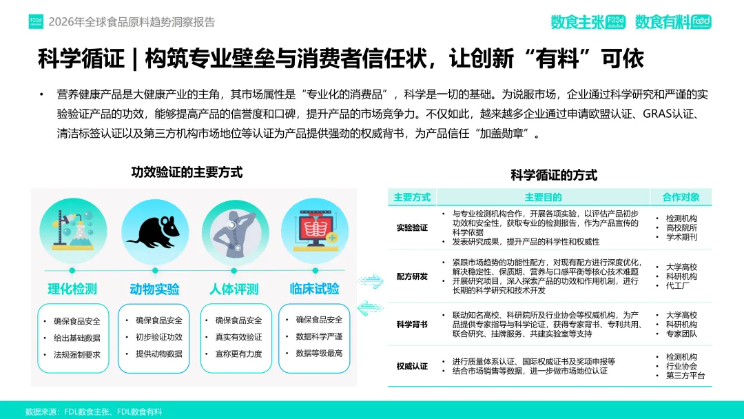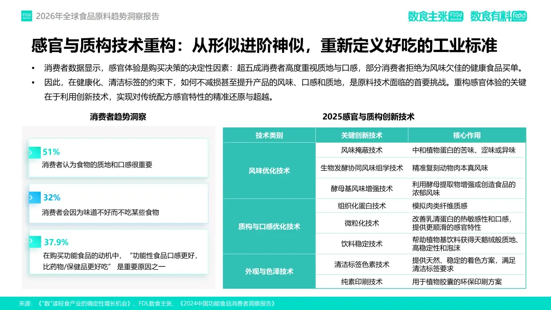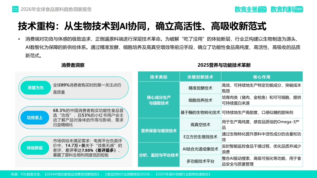 在这一趋势驱动下,FDL数食主张与FDL数食有料联合发布《2026年全球食品原料趋势洞察报告》,基于对2025年全球98家企业、128款新原料的深度分析,提出四大核心趋势:功效升维、人群细化、品质重塑与信任构建。本报告旨在为行业从业者提供前沿洞察,赋能供应链创新与产品升级,助力企业在合规趋严、竞争加剧的市场中构建差异化竞争力。