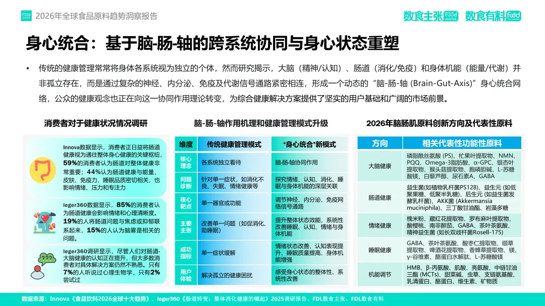 报告还指出,2026年食品原料创新将深度融合科学循证、技术赋能与人群精准化三大逻辑。企业需在功效可感知、生产可持续、信息可追溯的框架下,通过跨学科协作与数据驱动,实现从供应链到消费端的价值重构。未来,随着脑-肠-轴研究、细胞级抗衰等前沿领域的突破,原料行业有望进一步推动食品原料实现代际升级。