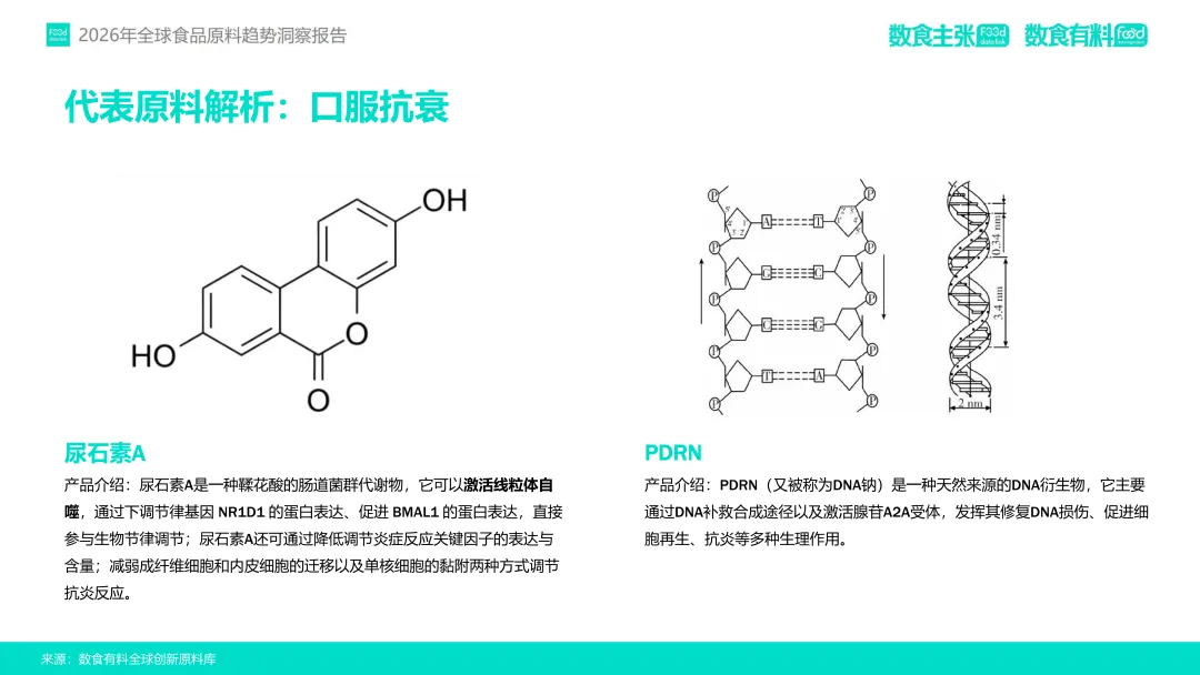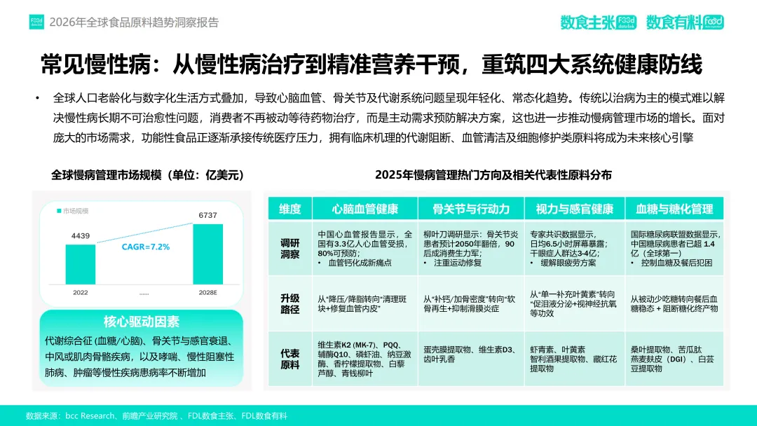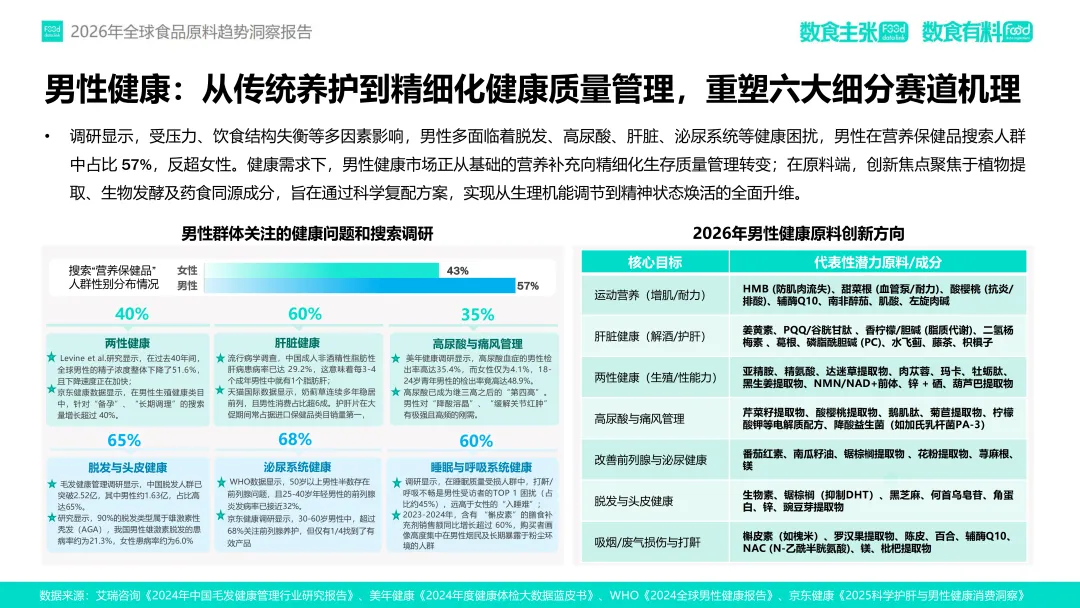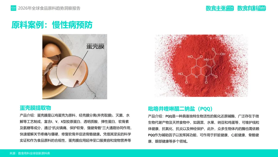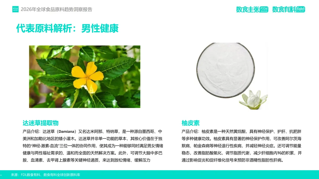女性健康领域,围绕经期、孕产、更年期等阶段提出天然解决方案,如S-雌马酚通过雌激素受体调节缓解潮热,黑麦花粉调控激素平衡改善更年期综合征。男性健康则从基础养护转向精细化管理,针对脱发、高尿酸、运动营养等需求,达迷草提取物通过神经-激素协同增强两性健康,柚皮素则在护肝与神经保护中凸显价值。此外,慢性病预防前移趋势显著,功能性食品通过成分如蛋壳膜提取物(关节修复)、PQQ(线粒体保护)等承接传统医疗未满足需求,重筑心脑血管、骨关节、代谢系统健康防线。