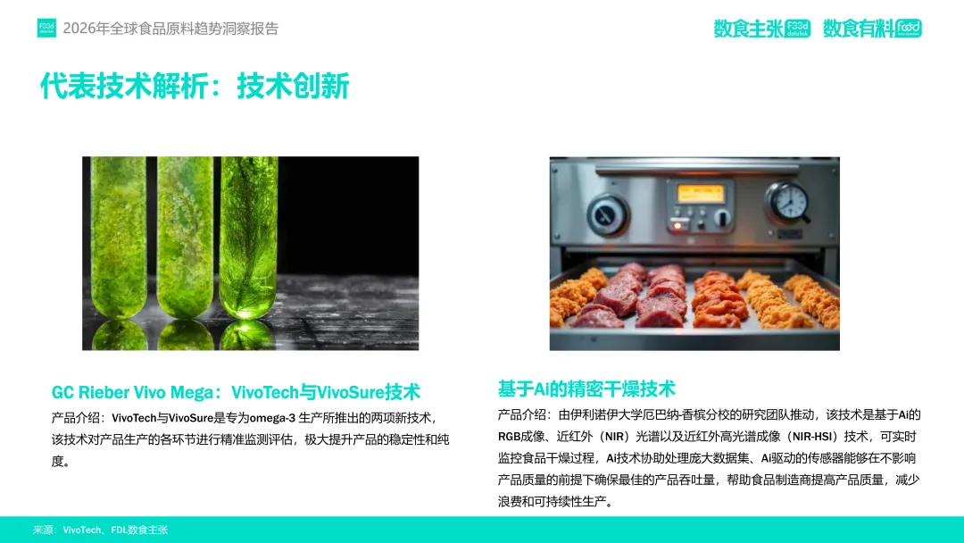 值得一提的是,面对消费者对口感与功效的双重期待,技术创新成为破局关键。感官层面,风味掩蔽、组织化蛋白等技术助力植物基产品还原肉质感官,清洁标签色素技术满足天然着色需求。功能层面,精准发酵、细胞培养等技术提升成分纯度与生物利用度,例如AI驱动的干燥技术优化产品稳定性,高真空技术保障Omega-3活性。可持续发展理念亦贯穿产业链,全素食胶囊、副产物衍生乳化剂等绿色方案推动行业向环保转型。