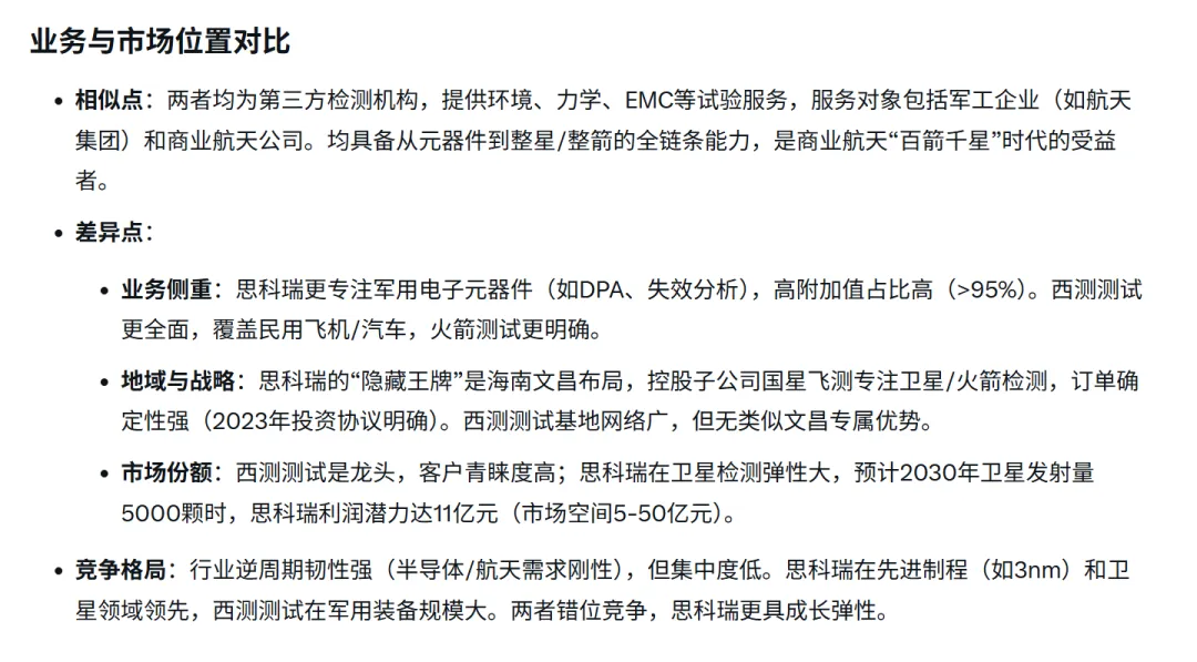 主要的竞争对手,西测测试,广电计量,苏试试验,胜科纳米;这其中业务重叠度最高的就是西测测试,详细对比下这两家公司,思科瑞的主要对标物就是西测测试,卯着劲干就可以了。