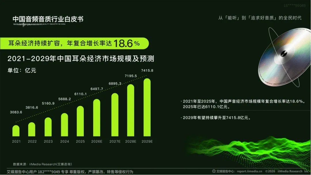 《2026年中国音频音质行业白皮书》指出,中国音频音质行业已迈入从“能听”到“追求好音质”的全民时代,耳朵经济持续扩容,2021-2025年年复合增长率达18.6%,2025年市场规模达6110.1亿元,2029年有望攀升至7415.8亿元。
