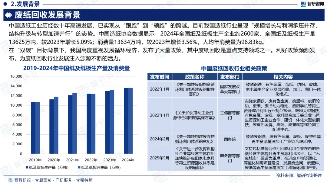 发展背景:中国造纸工业历经数十年高速发展,已实现从“跟跑”到“领跑”的跨越。目前我国造纸行业呈现“规模增长与利润承压并存、结构升级与转型加速并行”的态势。2024年全国纸及纸板生产企业约2600家,全国纸及纸板生产量13625万吨,较2023年增长5.09%;消费量13634万吨,较2023年增长3.56%。