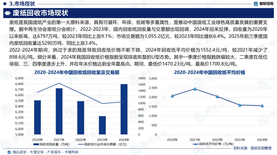 废纸回收是指将废弃的纸张进行收集、分类、处理和再生利用的一种环保行为,包括纸箱、纸板、报纸、书本、纸张、信封、广告单、快递包装盒等。废纸是我国造纸产业的第一大原料来源,具有可循环、环保、低碳等多重属性,是推动中国造纸工业绿色高质量发展的重要支撑。据中再生协会废纸分会统计,2022-2023年,国内回收纸回收量与交易额出现回调,2024年迎来反弹,回收量为2020年以来新高,达6797万吨,较2023年同比上涨9.1%;市场交易额为1055.2亿元,较2023年同比增长6.4%。2025年前三季度国内废纸回收量达5290万吨,同比上涨3.4%。2022-2024年期间,供过于求的局面导致回收纸价格不断下跌,2024年回收纸平均价格为1552.4元/吨,较2021年减少了898.6元/吨。细分来看,2024年我国回收纸价格指数呈现探底恢复的U型态势。其中一季度价格指数跌幅较大,二季度在低位徘徊,三、四季度逐步上升,并在年末价格达到全年最高点。期间,最低价1470.23元/吨,最高价1700.8元/吨。我国废纸回收体系尚未完全建成,废纸回收量率仍较低,2024年我国废纸回收率为51.1%,废纸利用率为51.6%,远低于欧美地区,具备较大提升空间。我国废纸回收行业企业众多,竞争格局较为分散,且以中小企业为主。2024年国内经营量100吨/天以上单体回收纸打包厂共计81个,较2023年减少35个,同比下降30.2%。经营量50-100吨/天单体回收纸打包厂数量为755个,较上年略有增长,同比微增5.0%。经营量30-50吨/天单体回收纸打包厂数量为2420个,较2023年减少2.1%。整体来看,行业仍面临利润微薄、竞争粗放的挑战,2024年回收纸行业前20强企业平均净利率仅为1.13%,处于较低水平。未来,在智能升级、全产业链协同与标准提升的共同驱动下,废纸回收行业有望逐步摆脱低效竞争,走向高质量、高附加值的发展新阶段。