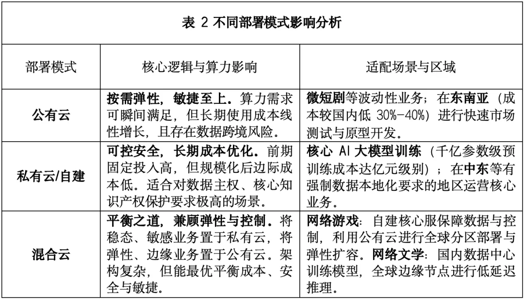 将上述分场景测算结果汇总后,核心任务是根据“文化新三样”等出海业务比例,进行异构算力的配比优化与部署模式选择。
