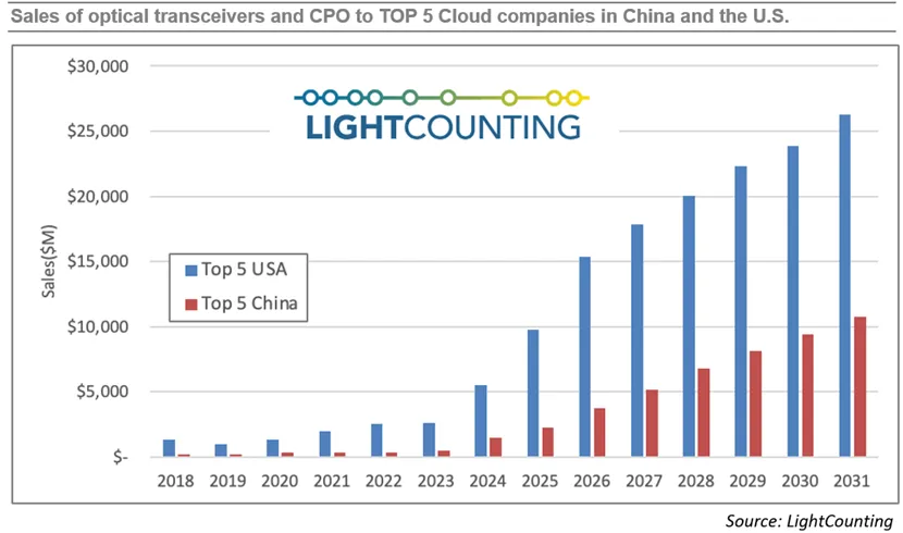 下图呈现我们对中美两国五大云厂商的以太网光模块及CPO/NPO销售额预估。根据我们最新预测,中美市场规模差距正持续收窄:从2022年的7倍差距缩小至2024-2025年的4倍,预计到2031年将进一步降至2.5倍。2025-2031年复合年增长率数据尤为显著:美国市场预计为18%,而中国市场将达29%。