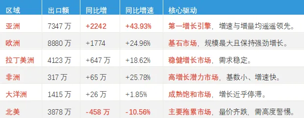 机会:亚洲市场(尤其是东亚、东南亚)已成为不可忽视的增长极。其高达43.93%的增速表明,该区域可能存在新的应用场景、供应链替代需求或消费升级趋势。