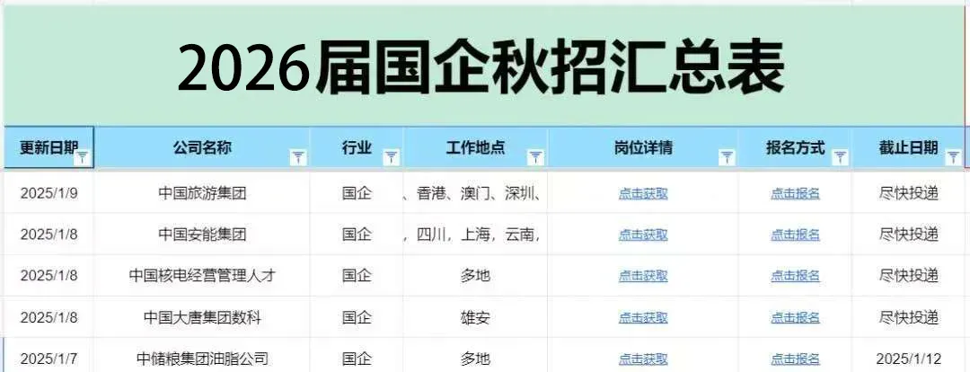 (◇以上是部分往期汇总信息截图,更多进群领取) 2026届秋招汇总表 2025年实习汇总表 2025年外企汇总表 2025年社招汇总表 2026届国企秋招表 2025远程实习表 2026外企校招汇总表 2026届事业编招聘汇总表 2026届银行秋招表 2026届暑期实习表 2026届金融秋招表 2026届春招汇总表 2026届互联网秋招表 2025年日常实习表 2026届咨询秋招表 2026届HK招聘表 2026届车企秋招表 2026届高端制造秋招表 2026届医院/医疗招聘表 2026届地产秋招表 2026届事务所秋招表 2026 summer intern list 2026届券商秋招表 2026届基金行业秋招表