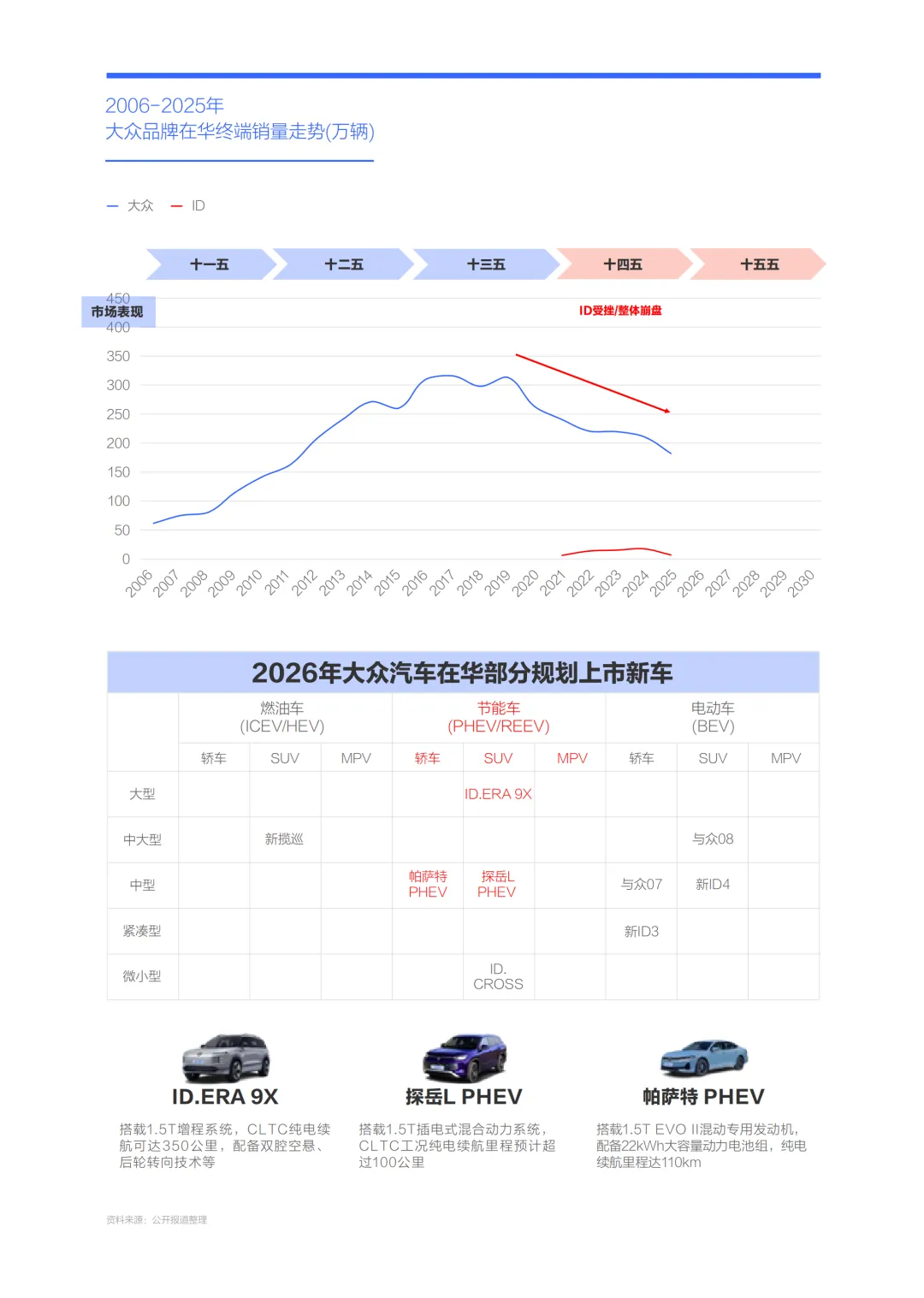 核心产品涵盖多款节能车型,大增程SUV ID.ERA 9X搭载1.5T增程系统,CLTC纯电续航达350km,还配备双腔空悬与后轮转向,竞争力拉满;新探岳L PHEV和新帕萨特PHEV均升级1.5T动力,纯电续航分别超100km和110km,适配家庭日常通勤需求。技术层面优化自身P2路线,同时引进上汽DHT技术,补齐混动领域短板。市场定位锚定主流家用车市场,区别于纯电车型的代步属性,避开与自身二手车的直接竞争,以差异化优势抵御比亚迪等竞品冲击,留住核心老用户,这也是大众在华翻盘的关键抓手。