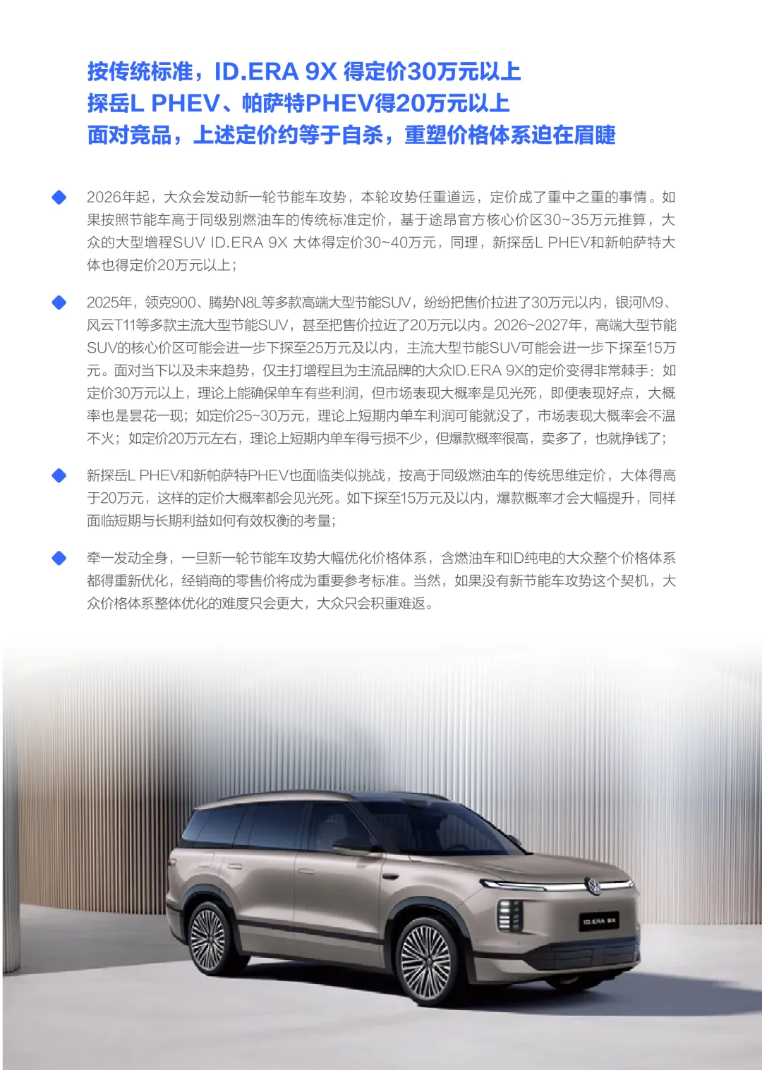 必要性毋庸置疑,当前车市成本与价格博弈激烈,比亚迪、吉利等品牌定价激进,大众原有价格体系僵化,已难以应对竞争。经销商因价格倒挂陷入亏损,退网风险加剧,亟需通过价格调整减负。若延续旧定价,ID.ERA 9X超30万、探岳L PHEV超20万的售价,与高端大型节能SUV核心价区下探至25万内的市场现状脱节,大概率无人问津。可行性也有充足支撑,大众曾靠“奥林匹克计划”“MQB平台降本”应对过市场冲击,有成熟经验可循。全价值链本土化推进带来充足降本空间,融入中系供应链后,还能借力中国动力电池优势控制成本,再加上2026年宝马率先官降给出行业参考,为其价格体系优化铺路。