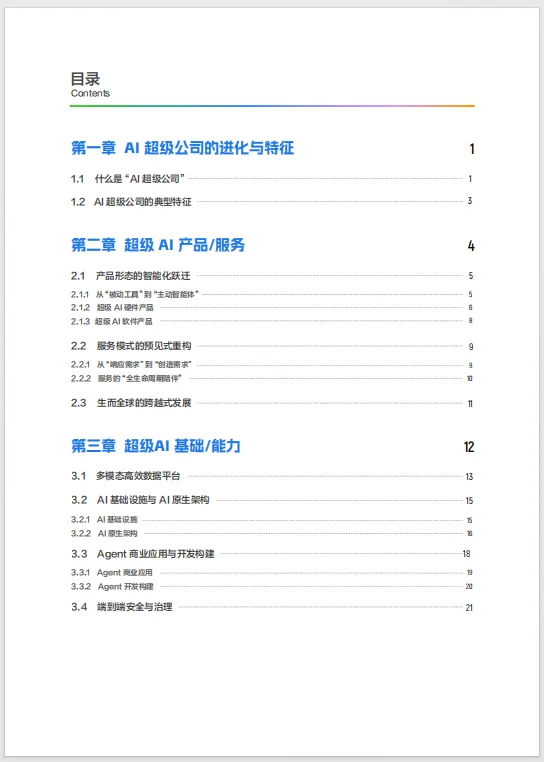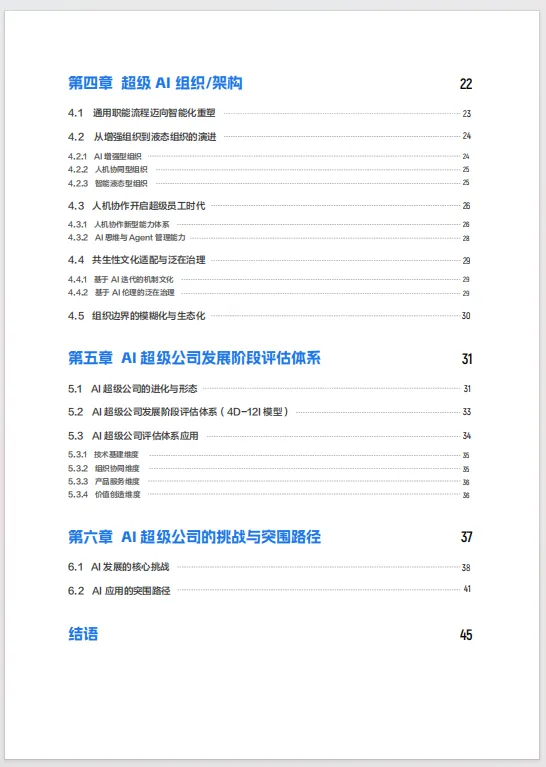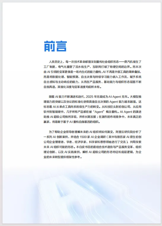 这份《AI超级公司白皮书:企业进化与价值重塑》50页能为企业领导者、从业者及研究者系统理解AI驱动的组织变革提供全景式指引,助力把握未来商业形态演进方向。它以“AI超级公司”为核心,融合技术趋势、实践案例与理论框架,解析其从定义到落地的完整逻辑,帮助读者跳出“AI工具论”局限,认知AI作为底层生产力重构企业基因的本质——不仅是技术叠加,更是产品服务、组织架构与基础能力的系统性重塑。文档通过1500家企业调研及原生AI公司访谈,提炼出“产品/服务-组织/架构-基础/能力”三维特征,明确AI超级公司是深度整合AI、以人机协作为核心的新型组织,可覆盖科技巨头、初创公司及转型传统企业,打破“规模决定论”。在具体层面,文档拆解超级AI产品从“被动工具”到“主动智能体”的跃迁路径,涵盖硬件(辅助型、模型驱动型、原生智能型)与软件(智能助手、任务型Agent、协作式Agentic AI)的形态演进,以及服务模式从“响应需求”到“创造需求”“全生命周期陪伴”的重构逻辑,为企业产品创新提供方向;剖析超级AI基础能力的关键支撑,包括多模态数据平台、AI基础设施与原生架构、Agent开发构建及端到端安全治理,解决数据孤岛、技术落地瓶颈等实操难题;阐述组织从增强型到液态型的演进路径,强调人机协同催生的“超级员工”能力体系(提示词工程、数据治理等)及共生文化、泛在治理的重要性,指导组织转型与人才策略制定。此外,文档提出4D-12I评估模型,通过技术基建、组织协同、产品服务、价值创造四维度12项指标,帮助企业定位AI转型阶段、诊断短板;针对数据孤岛、技术适配难、组织阻力、伦理风险等核心挑战,给出数据治理、垂直模型迭代、跨部门协同、伦理委员会等突围路径,并附企业管理者调研数据(如AI应用落地策略、人力资源策略优先级),增强实践参考性。无论是战略规划、技术应用还是组织升级,文档均提供框架性指引与可操作方法论,助力企业从“适应AI”转向“定义AI”,在智能时代构建代际竞争优势。