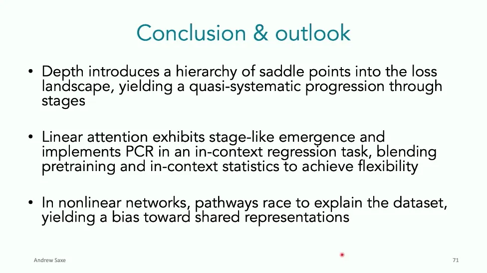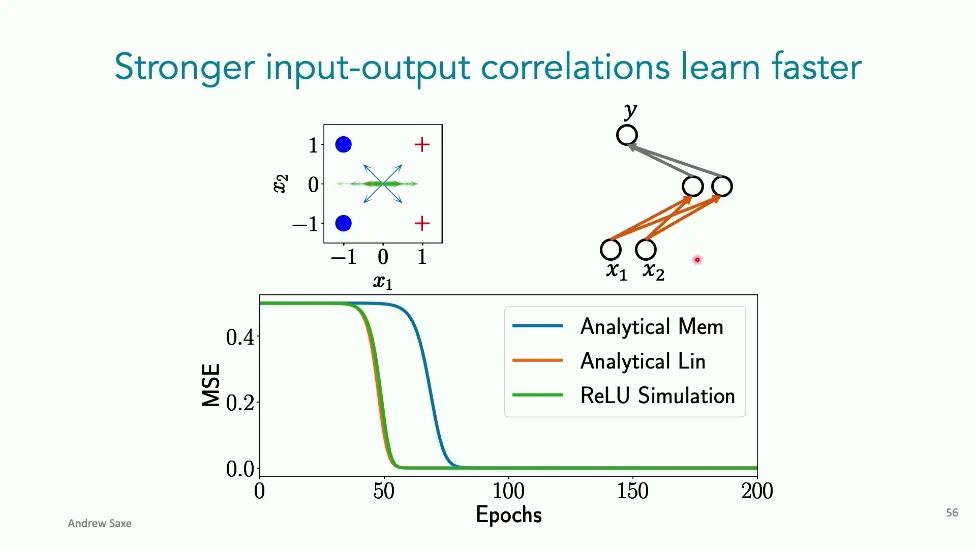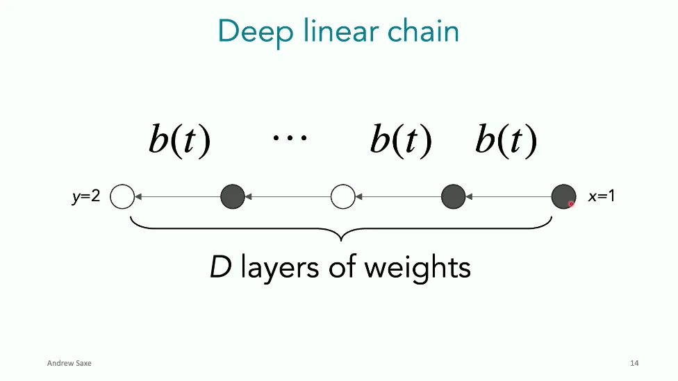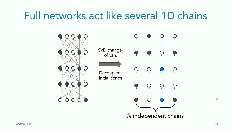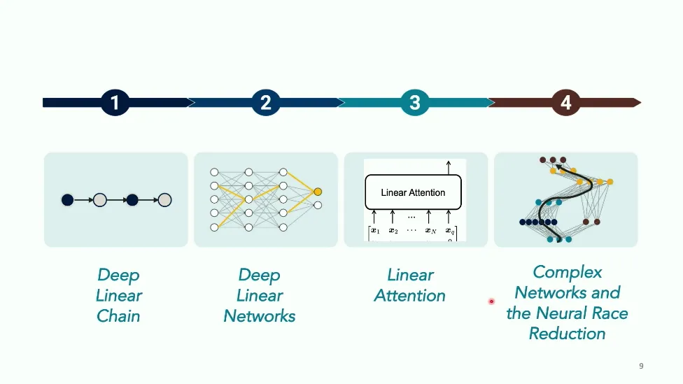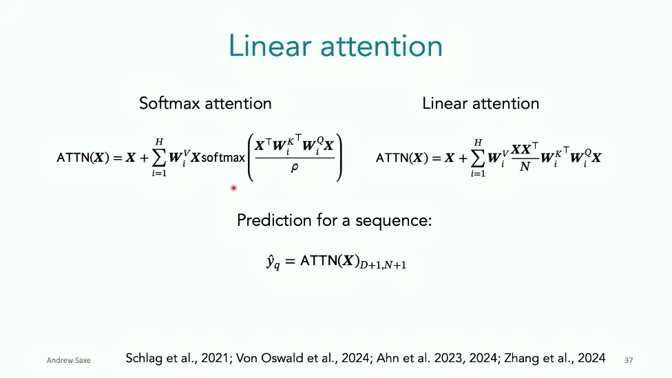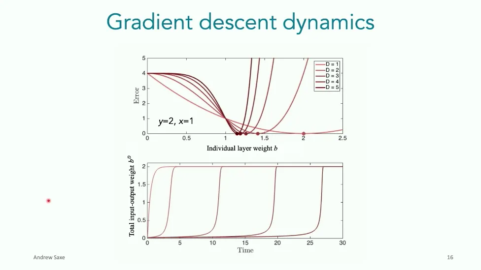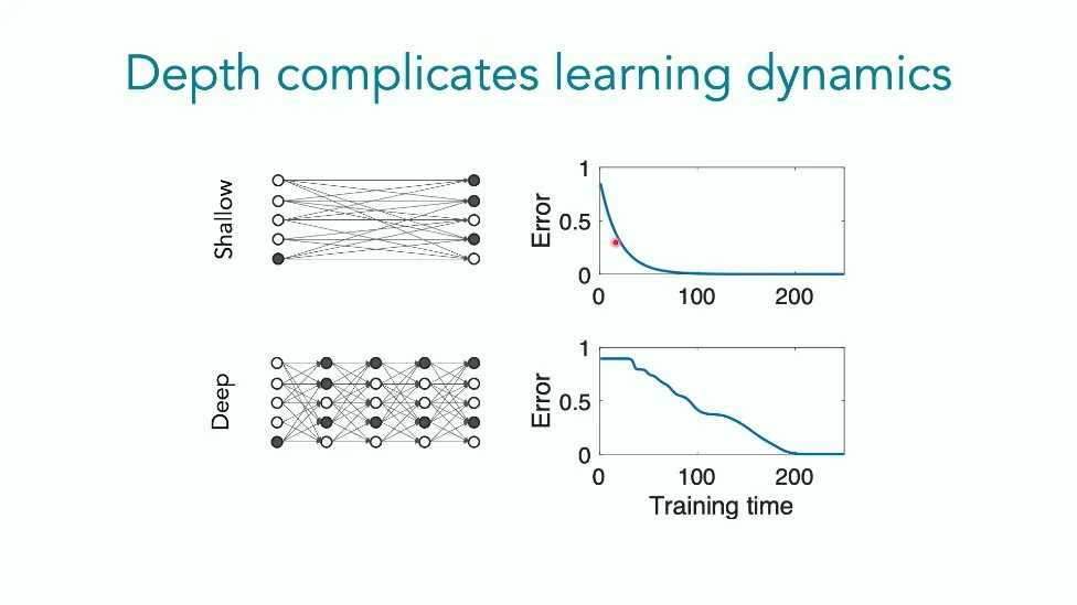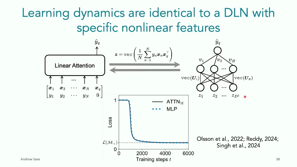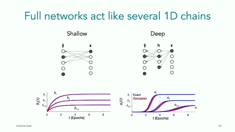 可能对于学术圈和模型层的研究员来说,本文内容并不新鲜,但对于本公众号的读者来说,这篇文章值得我搬运一下。内容中有一些Latex格式目前我还没有低成本的方式进行处理,以及图片也没有做翻译。非常荣幸能在这里进行 Breiman 讲座。如今,人工智能正以前所未有的速度发展。我们现在的系统已经能够识别自动驾驶汽车所需的物体,击败世界顶尖的围棋选手,甚至用自然语言与我们交谈并进行数学推理。尽管这些系统改变了世界,且表现出色,但它们在很大程度上仍是我们难以理解的“黑盒”。如果能理解它们的工作原理,将大有裨益。因此,本次讲座我将介绍我们实验室在探索支配这些系统学习原理方面的工作。为了展示深度网络中令人困惑的特性,这里有一个“深度使学习动力学复杂化”的例子。首先看一个浅层网络,没有隐藏层,只是神经元阵列间的投影。在训练时,你会看到误差沿着一条简单的指数曲线下降。但是,如果我加入一些中间处理层(即增加深度),其他设置保持不变。现在的训练轨迹变得更加错综复杂、非线性,甚至出现了几乎没有提升的“平台期”。这就是深度学习理论要解决的问题。通常当你设计深度网络时,你会选择数据集、架构和算法,然后用大量的算力去“摇动曲柄”(turn a crank),最终得到训练速度或基准性能等结果。而理论的任务——至少我的理解是——要在不进行计算机模拟的情况下,形式化地建立从设计端到结果端的连接。理论界主要有两条路线:一条来自数学和计算机科学,强调最坏情况下的性能保证;另一条来自物理学和理论神经科学,更关注平均情况下的性能和理想化模型。我主要关注后者。如果我们想像物理学那样理解深度网络,就必须转向简化的“替代模型”(surrogate models)。我们需要对这些系统的本质特征进行“漫画式”的概括,并希望保留完整问题的关键特征。这就像盒子里的气体粒子,实际情况极其复杂。但如果你观察施加在墙壁上的压力,这其实是大量气体分子行为的一个“统计摘要”(summary statistic)。我们可以用这种抽象层级来构建理论,这也正是我们理解深度网络所寻找的方法。今天,我将带大家通过一系列简单的理想化模型来探讨这个问题。我们将从极简的“深度线性链”(Deep Linear Chain)开始——这看起来可能简单得令人痛苦,但请稍安勿躁。我们将逐步将其扩展到深度线性网络,进而理解线性注意力机制(Linear Attention)和上下文学习(In-context learning)的某些方面,最后延伸到复杂的非线性网络和神经竞赛(Neural Race)理论。我们先来探讨“深度线性链”。为了引入这个代理模型,我们先看真实情况:这是一个非线性深度网络,包含多层处理单元和层间的加权连接。分析这种网络的主要难点在于神经元的非线性。因此,作为构建简单模型的第一步,我们可以采取一个非常激进的措施:直接剥离所有的非线性。这就是“深度线性神经网络”。对于这个网络,我们可以最小化均方误差损失。然而,一旦存在一个或多个隐藏层,这个最小化问题——也就是我们要解决的终极学习问题——就会变成非凸的(non-convex)。这是一个非凸优化的玩具模型。如果我们计算梯度流动力学,你会发现方程相当复杂,包含权重的三次交互项,且是非线性的。而且数据仅通过输入输出相关性和输入相关矩阵(即数据的二阶统计量)进入方程。我们的目标是理解学习的动力学,解出这些方程。为了简化起见,我们进一步退一步,研究“深度线性链”。如图所示,这个网络只是单神经元层层相连。例如,我们输入值 1,期望输出值 2。进一步假设每一层的初始权重相等(记为 $b$),并保持相等。这样我就可以展示它真实的误差曲面了。这不是示意图,而是真实的计算结果。图中横轴是层权重,纵轴是误差,不同颜色代表不同深度的网络。你可以看到,浅层网络只是一个简单的二次碗状结构;而深层网络形状复杂得多:原点处有一个鞍点(saddle point),紧邻鞍点的是一个平台期(plateau)。虽然没有局部极小值让你“卡住”,但如果从平台期开始,学习会非常缓慢。如果我们从损失曲面上启动一组网络进行训练,可以看到它们的动力学差异:浅层网络呈指数级迅速逼近目标;而深层网络需要更长时间逃离平台期,呈现出 S 形(Sigmoidal)的训练轨迹。这个模型虽然简单,但允许我们解析地求解整体输入-输出映射的动力学,从而回答一个关键问题:训练速度如何随深度变化?从方程中得出的结果是,深层网络与浅层网络的时间差,大致等于数据集输入输出相关性 $S$ 的倒数,乘以初始权重 $b_0$ 的 $D$ 次方。我非常喜欢这个表达式,因为它将关于数据集的属性(输入输出相关性)、关于初始化的属性($b_0$)以及关于网络架构的属性(深度 $D$),与一个涌现属性——学习速度——简洁地联系在了一起。这带来两个关键预测:第一,更强的输入输出相关性会被学得更快;第二,深度学习对初始化高度敏感。想象一下,如果 $b_0$ 很小(比如 0.1),$0.1$ 的 $D$ 次方会非常小,导致速度随深度呈指数级下降。反之,如果 $b_0$ 接近 1,深度网络只比浅层网络慢常数倍。这解释了初始化的效应:小的随机权重会导致随深度指数级变慢;而现代实践中的做法是正确缩放初始化使其足够大,从而获得几乎与深度无关的训练时间。总结来说,深度在损失景观中引入了鞍点,导致动力学在鞍点附近变慢,产生阶梯状的学习