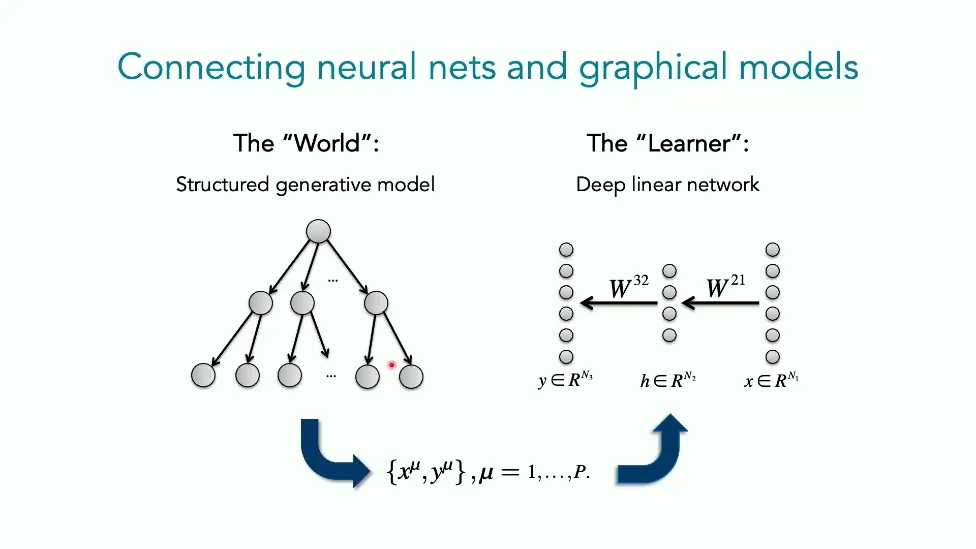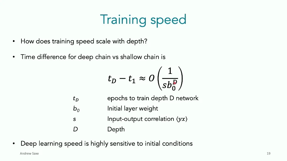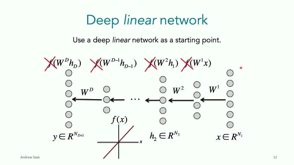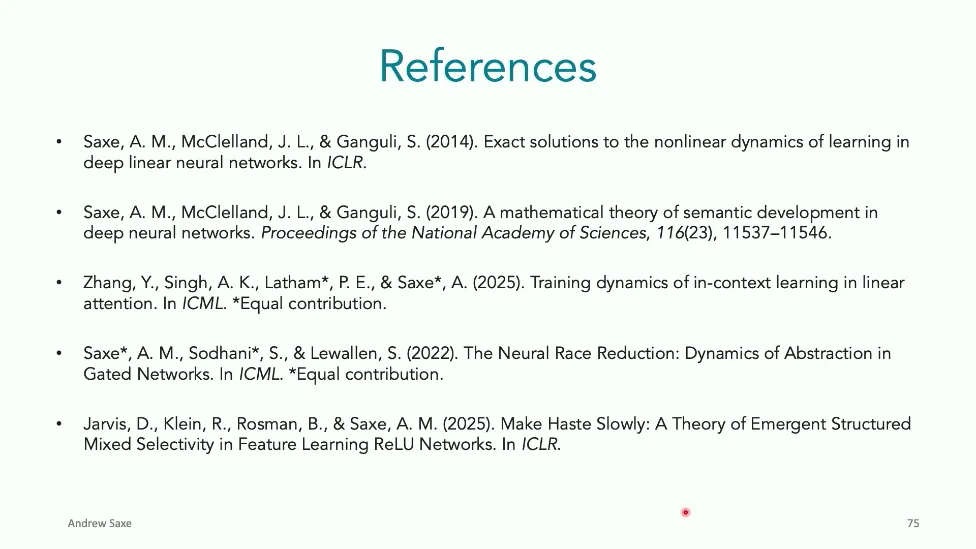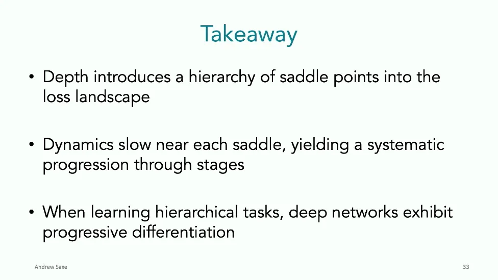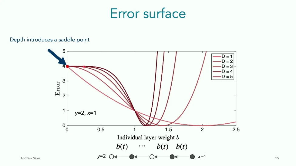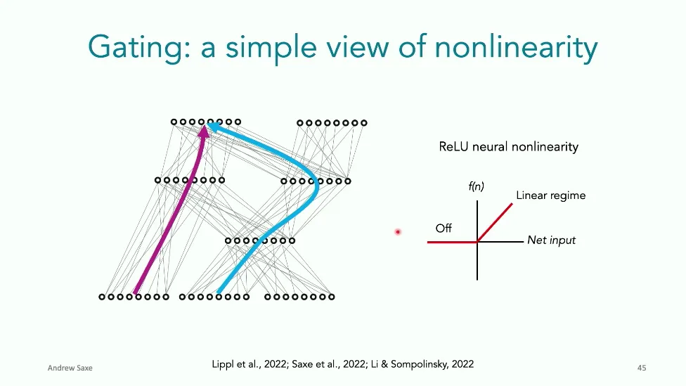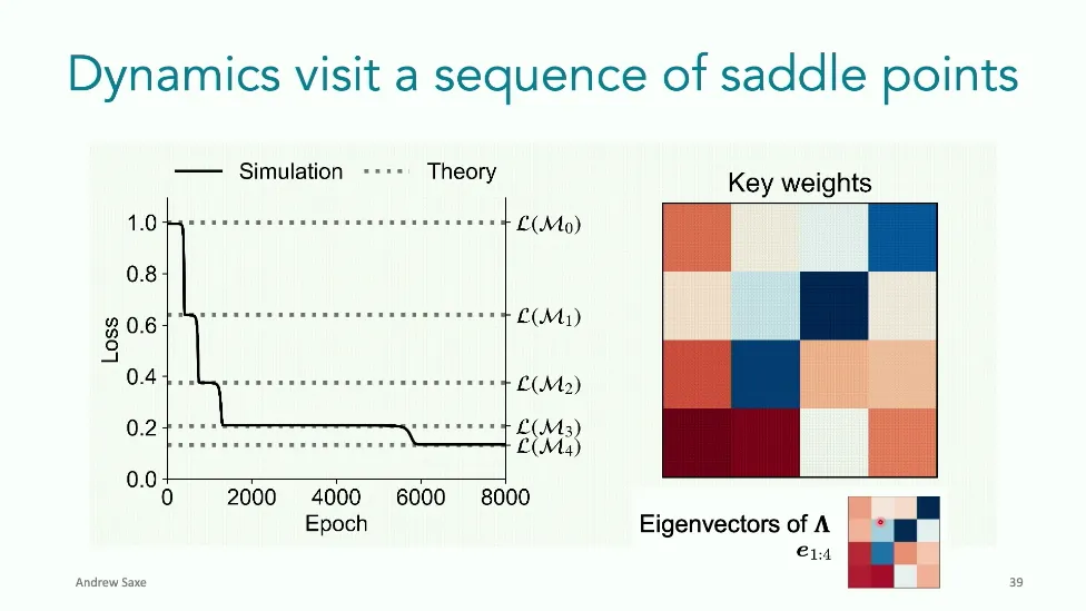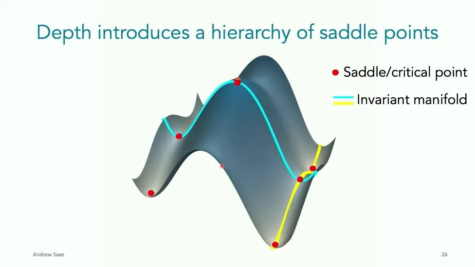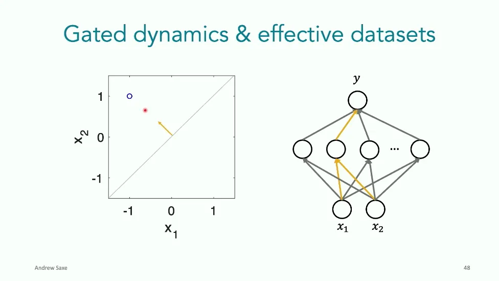 可能对于学术圈和模型层的研究员来说,本文内容并不新鲜,但对于本公众号的读者来说,这篇文章值得我搬运一下。内容中有一些Latex格式目前我还没有低成本的方式进行处理,以及图片也没有做翻译。非常荣幸能在这里进行 Breiman 讲座。如今,人工智能正以前所未有的速度发展。我们现在的系统已经能够识别自动驾驶汽车所需的物体,击败世界顶尖的围棋选手,甚至用自然语言与我们交谈并进行数学推理。尽管这些系统改变了世界,且表现出色,但它们在很大程度上仍是我们难以理解的“黑盒”。如果能理解它们的工作原理,将大有裨益。因此,本次讲座我将介绍我们实验室在探索支配这些系统学习原理方面的工作。为了展示深度网络中令人困惑的特性,这里有一个“深度使学习动力学复杂化”的例子。首先看一个浅层网络,没有隐藏层,只是神经元阵列间的投影。在训练时,你会看到误差沿着一条简单的指数曲线下降。但是,如果我加入一些中间处理层(即增加深度),其他设置保持不变。现在的训练轨迹变得更加错综复杂、非线性,甚至出现了几乎没有提升的“平台期”。这就是深度学习理论要解决的问题。通常当你设计深度网络时,你会选择数据集、架构和算法,然后用大量的算力去“摇动曲柄”(turn a crank),最终得到训练速度或基准性能等结果。而理论的任务——至少我的理解是——要在不进行计算机模拟的情况下,形式化地建立从设计端到结果端的连接。理论界主要有两条路线:一条来自数学和计算机科学,强调最坏情况下的性能保证;另一条来自物理学和理论神经科学,更关注平均情况下的性能和理想化模型。我主要关注后者。如果我们想像物理学那样理解深度网络,就必须转向简化的“替代模型”(surrogate models)。我们需要对这些系统的本质特征进行“漫画式”的概括,并希望保留完整问题的关键特征。这就像盒子里的气体粒子,实际情况极其复杂。但如果你观察施加在墙壁上的压力,这其实是大量气体分子行为的一个“统计摘要”(summary statistic)。我们可以用这种抽象层级来构建理论,这也正是我们理解深度网络所寻找的方法。今天,我将带大家通过一系列简单的理想化模型来探讨这个问题。我们将从极简的“深度线性链”(Deep Linear Chain)开始——这看起来可能简单得令人痛苦,但请稍安勿躁。我们将逐步将其扩展到深度线性网络,进而理解线性注意力机制(Linear Attention)和上下文学习(In-context learning)的某些方面,最后延伸到复杂的非线性网络和神经竞赛(Neural Race)理论。我们先来探讨“深度线性链”。为了引入这个代理模型,我们先看真实情况:这是一个非线性深度网络,包含多层处理单元和层间的加权连接。分析这种网络的主要难点在于神经元的非线性。因此,作为构建简单模型的第一步,我们可以采取一个非常激进的措施:直接剥离所有的非线性。这就是“深度线性神经网络”。对于这个网络,我们可以最小化均方误差损失。然而,一旦存在一个或多个隐藏层,这个最小化问题——也就是我们要解决的终极学习问题——就会变成非凸的(non-convex)。这是一个非凸优化的玩具模型。如果我们计算梯度流动力学,你会发现方程相当复杂,包含权重的三次交互项,且是非线性的。而且数据仅通过输入输出相关性和输入相关矩阵(即数据的二阶统计量)进入方程。我们的目标是理解学习的动力学,解出这些方程。为了简化起见,我们进一步退一步,研究“深度线性链”。如图所示,这个网络只是单神经元层层相连。例如,我们输入值 1,期望输出值 2。进一步假设每一层的初始权重相等(记为 $b$),并保持相等。这样我就可以展示它真实的误差曲面了。这不是示意图,而是真实的计算结果。图中横轴是层权重,纵轴是误差,不同颜色代表不同深度的网络。你可以看到,浅层网络只是一个简单的二次碗状结构;而深层网络形状复杂得多:原点处有一个鞍点(saddle point),紧邻鞍点的是一个平台期(plateau)。虽然没有局部极小值让你“卡住”,但如果从平台期开始,学习会非常缓慢。如果我们从损失曲面上启动一组网络进行训练,可以看到它们的动力学差异:浅层网络呈指数级迅速逼近目标;而深层网络需要更长时间逃离平台期,呈现出 S 形(Sigmoidal)的训练轨迹。这个模型虽然简单,但允许我们解析地求解整体输入-输出映射的动力学,从而回答一个关键问题:训练速度如何随深度变化?从方程中得出的结果是,深层网络与浅层网络的时间差,大致等于数据集输入输出相关性 $S$ 的倒数,乘以初始权重 $b_0$ 的 $D$ 次方。我非常喜欢这个表达式,因为它将关于数据集的属性(输入输出相关性)、关于初始化的属性($b_0$)以及关于网络架构的属性(深度 $D$),与一个涌现属性——学习速度——简洁地联系在了一起。这带来两个关键预测:第一,更强的输入输出相关性会被学得更快;第二,深度学习对初始化高度敏感。想象一下,如果 $b_0$ 很小(比如 0.1),$0.1$ 的 $D$ 次方会非常小,导致速度随深度呈指数级下降。反之,如果 $b_0$ 接近 1,深度网络只比浅层网络慢常数倍。这解释了初始化的效应:小的随机权重会导致随深度指数级变慢;而现代实践中的做法是正确缩放初始化使其足够大,从而获得几乎与深度无关的训练时间。总结来说,深度在损失景观中引入了鞍点,导致动力学在鞍点附近变慢,产生阶梯状的学习