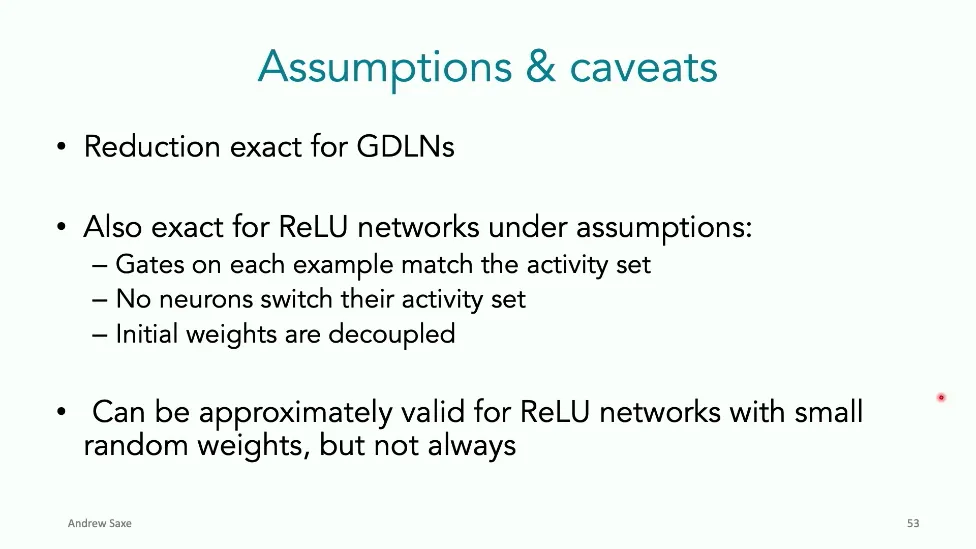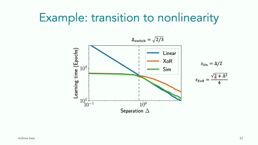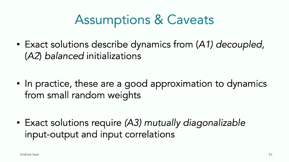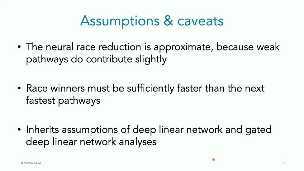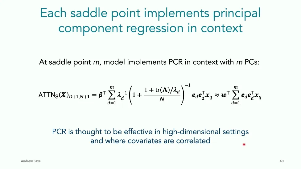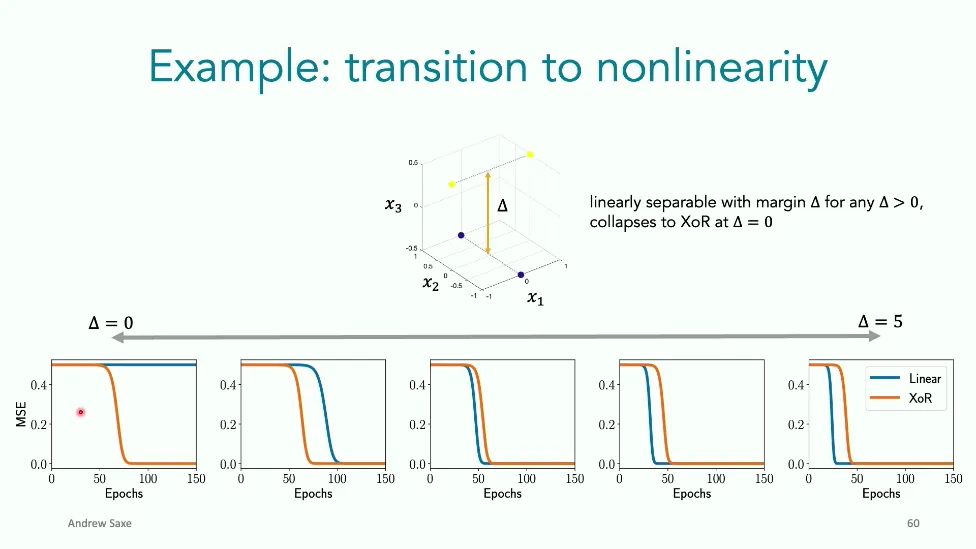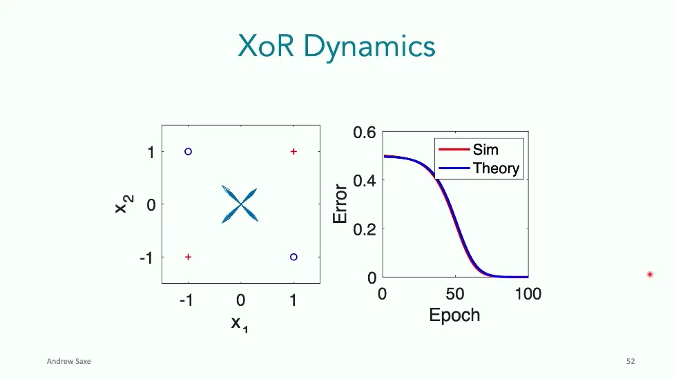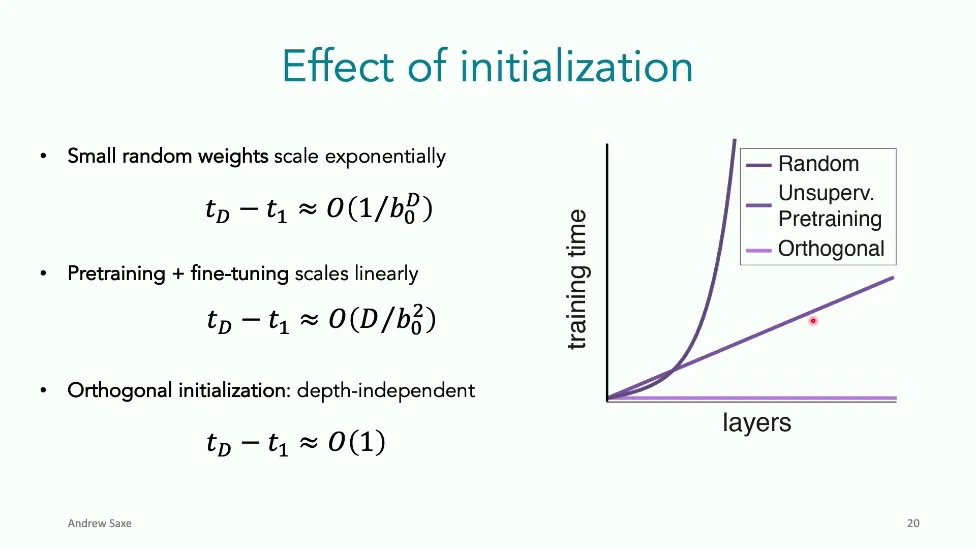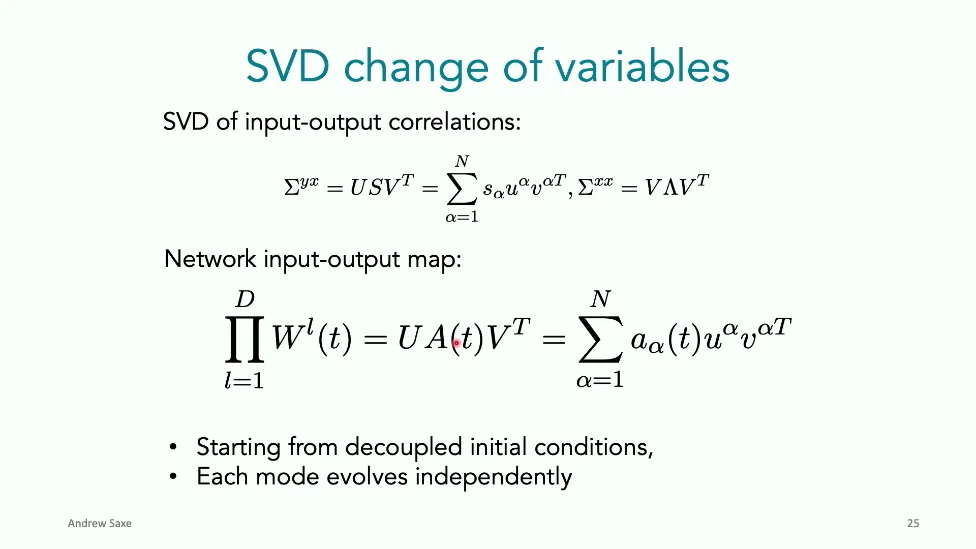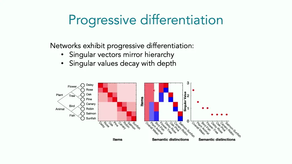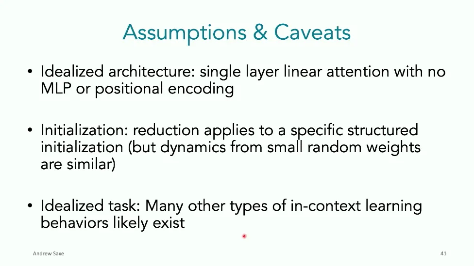 可能对于学术圈和模型层的研究员来说,本文内容并不新鲜,但对于本公众号的读者来说,这篇文章值得我搬运一下。内容中有一些Latex格式目前我还没有低成本的方式进行处理,以及图片也没有做翻译。非常荣幸能在这里进行 Breiman 讲座。如今,人工智能正以前所未有的速度发展。我们现在的系统已经能够识别自动驾驶汽车所需的物体,击败世界顶尖的围棋选手,甚至用自然语言与我们交谈并进行数学推理。尽管这些系统改变了世界,且表现出色,但它们在很大程度上仍是我们难以理解的“黑盒”。如果能理解它们的工作原理,将大有裨益。因此,本次讲座我将介绍我们实验室在探索支配这些系统学习原理方面的工作。为了展示深度网络中令人困惑的特性,这里有一个“深度使学习动力学复杂化”的例子。首先看一个浅层网络,没有隐藏层,只是神经元阵列间的投影。在训练时,你会看到误差沿着一条简单的指数曲线下降。但是,如果我加入一些中间处理层(即增加深度),其他设置保持不变。现在的训练轨迹变得更加错综复杂、非线性,甚至出现了几乎没有提升的“平台期”。这就是深度学习理论要解决的问题。通常当你设计深度网络时,你会选择数据集、架构和算法,然后用大量的算力去“摇动曲柄”(turn a crank),最终得到训练速度或基准性能等结果。而理论的任务——至少我的理解是——要在不进行计算机模拟的情况下,形式化地建立从设计端到结果端的连接。理论界主要有两条路线:一条来自数学和计算机科学,强调最坏情况下的性能保证;另一条来自物理学和理论神经科学,更关注平均情况下的性能和理想化模型。我主要关注后者。如果我们想像物理学那样理解深度网络,就必须转向简化的“替代模型”(surrogate models)。我们需要对这些系统的本质特征进行“漫画式”的概括,并希望保留完整问题的关键特征。这就像盒子里的气体粒子,实际情况极其复杂。但如果你观察施加在墙壁上的压力,这其实是大量气体分子行为的一个“统计摘要”(summary statistic)。我们可以用这种抽象层级来构建理论,这也正是我们理解深度网络所寻找的方法。今天,我将带大家通过一系列简单的理想化模型来探讨这个问题。我们将从极简的“深度线性链”(Deep Linear Chain)开始——这看起来可能简单得令人痛苦,但请稍安勿躁。我们将逐步将其扩展到深度线性网络,进而理解线性注意力机制(Linear Attention)和上下文学习(In-context learning)的某些方面,最后延伸到复杂的非线性网络和神经竞赛(Neural Race)理论。我们先来探讨“深度线性链”。为了引入这个代理模型,我们先看真实情况:这是一个非线性深度网络,包含多层处理单元和层间的加权连接。分析这种网络的主要难点在于神经元的非线性。因此,作为构建简单模型的第一步,我们可以采取一个非常激进的措施:直接剥离所有的非线性。这就是“深度线性神经网络”。对于这个网络,我们可以最小化均方误差损失。然而,一旦存在一个或多个隐藏层,这个最小化问题——也就是我们要解决的终极学习问题——就会变成非凸的(non-convex)。这是一个非凸优化的玩具模型。如果我们计算梯度流动力学,你会发现方程相当复杂,包含权重的三次交互项,且是非线性的。而且数据仅通过输入输出相关性和输入相关矩阵(即数据的二阶统计量)进入方程。我们的目标是理解学习的动力学,解出这些方程。为了简化起见,我们进一步退一步,研究“深度线性链”。如图所示,这个网络只是单神经元层层相连。例如,我们输入值 1,期望输出值 2。进一步假设每一层的初始权重相等(记为 $b$),并保持相等。这样我就可以展示它真实的误差曲面了。这不是示意图,而是真实的计算结果。图中横轴是层权重,纵轴是误差,不同颜色代表不同深度的网络。你可以看到,浅层网络只是一个简单的二次碗状结构;而深层网络形状复杂得多:原点处有一个鞍点(saddle point),紧邻鞍点的是一个平台期(plateau)。虽然没有局部极小值让你“卡住”,但如果从平台期开始,学习会非常缓慢。如果我们从损失曲面上启动一组网络进行训练,可以看到它们的动力学差异:浅层网络呈指数级迅速逼近目标;而深层网络需要更长时间逃离平台期,呈现出 S 形(Sigmoidal)的训练轨迹。这个模型虽然简单,但允许我们解析地求解整体输入-输出映射的动力学,从而回答一个关键问题:训练速度如何随深度变化?从方程中得出的结果是,深层网络与浅层网络的时间差,大致等于数据集输入输出相关性 $S$ 的倒数,乘以初始权重 $b_0$ 的 $D$ 次方。我非常喜欢这个表达式,因为它将关于数据集的属性(输入输出相关性)、关于初始化的属性($b_0$)以及关于网络架构的属性(深度 $D$),与一个涌现属性——学习速度——简洁地联系在了一起。这带来两个关键预测:第一,更强的输入输出相关性会被学得更快;第二,深度学习对初始化高度敏感。想象一下,如果 $b_0$ 很小(比如 0.1),$0.1$ 的 $D$ 次方会非常小,导致速度随深度呈指数级下降。反之,如果 $b_0$ 接近 1,深度网络只比浅层网络慢常数倍。这解释了初始化的效应:小的随机权重会导致随深度指数级变慢;而现代实践中的做法是正确缩放初始化使其足够大,从而获得几乎与深度无关的训练时间。总结来说,深度在损失景观中引入了鞍点,导致动力学在鞍点附近变慢,产生阶梯状的学习
