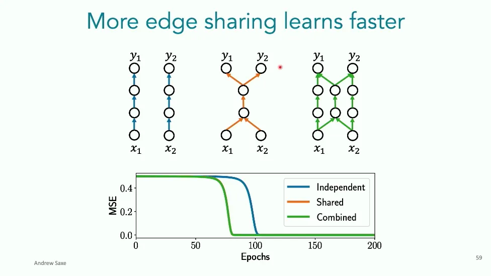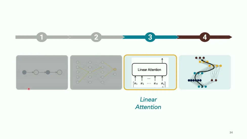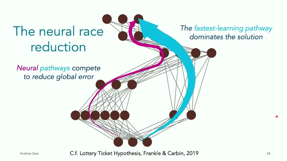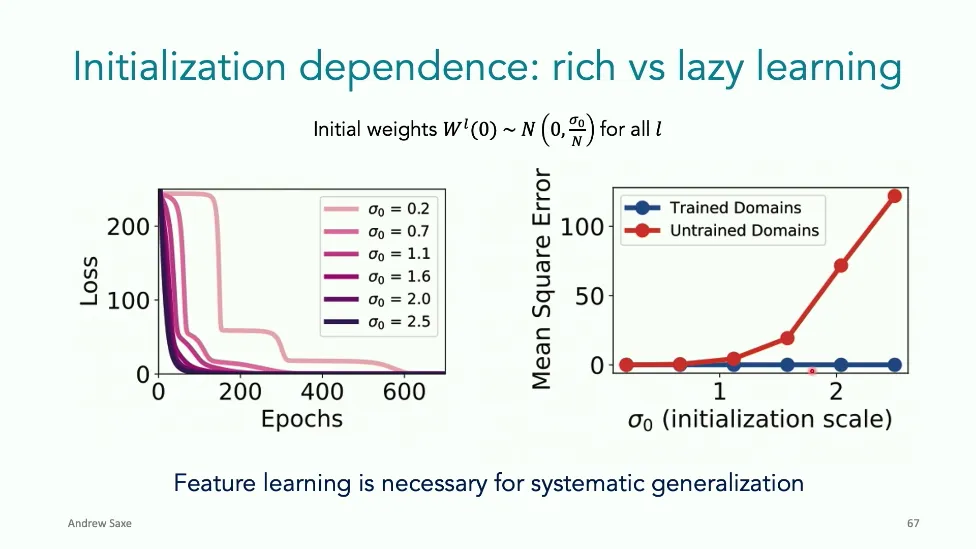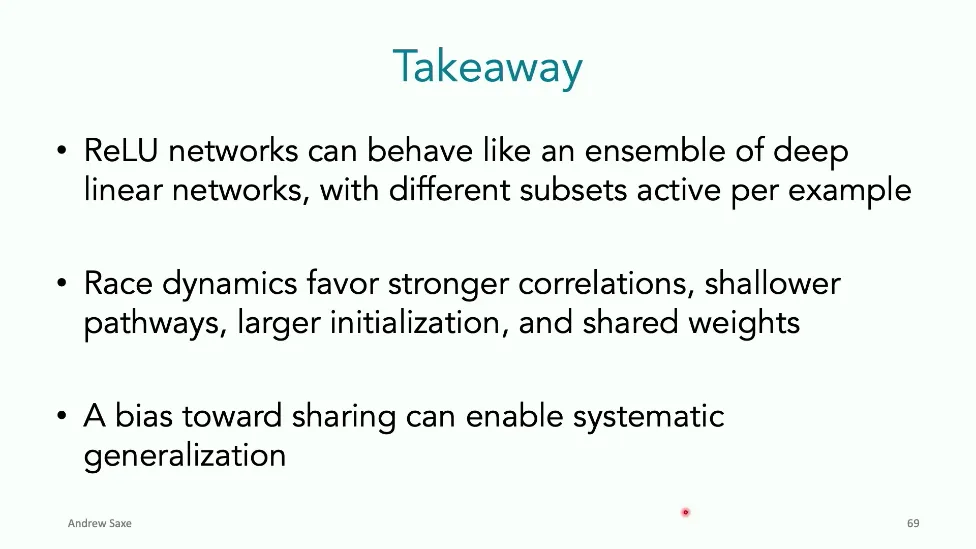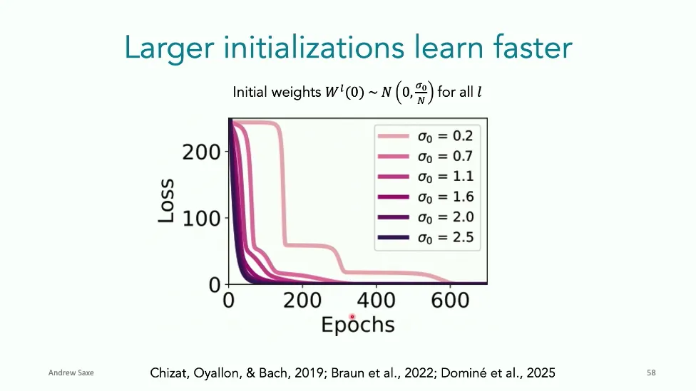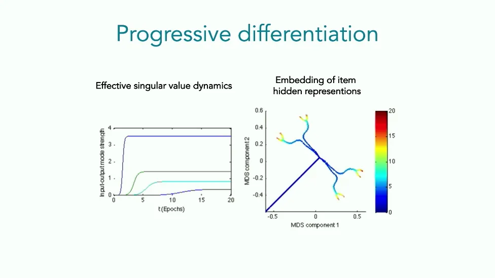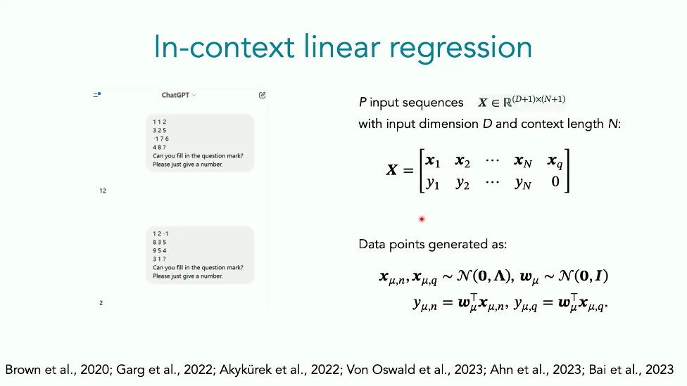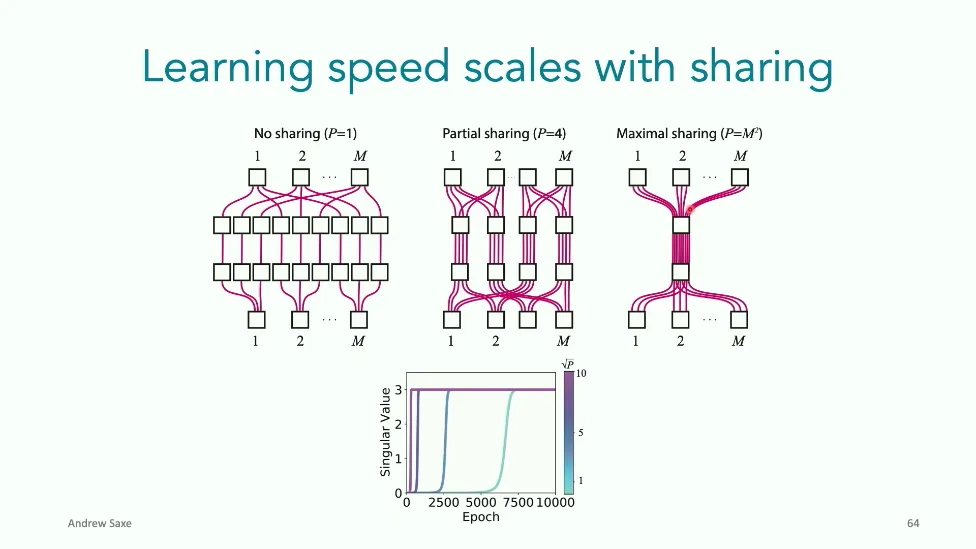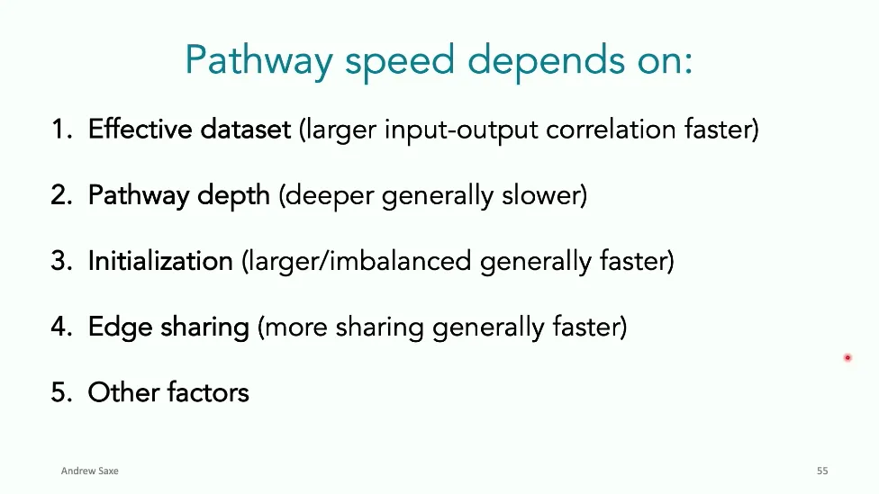 可能对于学术圈和模型层的研究员来说,本文内容并不新鲜,但对于本公众号的读者来说,这篇文章值得我搬运一下。内容中有一些Latex格式目前我还没有低成本的方式进行处理,以及图片也没有做翻译。非常荣幸能在这里进行 Breiman 讲座。如今,人工智能正以前所未有的速度发展。我们现在的系统已经能够识别自动驾驶汽车所需的物体,击败世界顶尖的围棋选手,甚至用自然语言与我们交谈并进行数学推理。尽管这些系统改变了世界,且表现出色,但它们在很大程度上仍是我们难以理解的“黑盒”。如果能理解它们的工作原理,将大有裨益。因此,本次讲座我将介绍我们实验室在探索支配这些系统学习原理方面的工作。为了展示深度网络中令人困惑的特性,这里有一个“深度使学习动力学复杂化”的例子。首先看一个浅层网络,没有隐藏层,只是神经元阵列间的投影。在训练时,你会看到误差沿着一条简单的指数曲线下降。但是,如果我加入一些中间处理层(即增加深度),其他设置保持不变。现在的训练轨迹变得更加错综复杂、非线性,甚至出现了几乎没有提升的“平台期”。这就是深度学习理论要解决的问题。通常当你设计深度网络时,你会选择数据集、架构和算法,然后用大量的算力去“摇动曲柄”(turn a crank),最终得到训练速度或基准性能等结果。而理论的任务——至少我的理解是——要在不进行计算机模拟的情况下,形式化地建立从设计端到结果端的连接。理论界主要有两条路线:一条来自数学和计算机科学,强调最坏情况下的性能保证;另一条来自物理学和理论神经科学,更关注平均情况下的性能和理想化模型。我主要关注后者。如果我们想像物理学那样理解深度网络,就必须转向简化的“替代模型”(surrogate models)。我们需要对这些系统的本质特征进行“漫画式”的概括,并希望保留完整问题的关键特征。这就像盒子里的气体粒子,实际情况极其复杂。但如果你观察施加在墙壁上的压力,这其实是大量气体分子行为的一个“统计摘要”(summary statistic)。我们可以用这种抽象层级来构建理论,这也正是我们理解深度网络所寻找的方法。今天,我将带大家通过一系列简单的理想化模型来探讨这个问题。我们将从极简的“深度线性链”(Deep Linear Chain)开始——这看起来可能简单得令人痛苦,但请稍安勿躁。我们将逐步将其扩展到深度线性网络,进而理解线性注意力机制(Linear Attention)和上下文学习(In-context learning)的某些方面,最后延伸到复杂的非线性网络和神经竞赛(Neural Race)理论。我们先来探讨“深度线性链”。为了引入这个代理模型,我们先看真实情况:这是一个非线性深度网络,包含多层处理单元和层间的加权连接。分析这种网络的主要难点在于神经元的非线性。因此,作为构建简单模型的第一步,我们可以采取一个非常激进的措施:直接剥离所有的非线性。这就是“深度线性神经网络”。对于这个网络,我们可以最小化均方误差损失。然而,一旦存在一个或多个隐藏层,这个最小化问题——也就是我们要解决的终极学习问题——就会变成非凸的(non-convex)。这是一个非凸优化的玩具模型。如果我们计算梯度流动力学,你会发现方程相当复杂,包含权重的三次交互项,且是非线性的。而且数据仅通过输入输出相关性和输入相关矩阵(即数据的二阶统计量)进入方程。我们的目标是理解学习的动力学,解出这些方程。为了简化起见,我们进一步退一步,研究“深度线性链”。如图所示,这个网络只是单神经元层层相连。例如,我们输入值 1,期望输出值 2。进一步假设每一层的初始权重相等(记为 $b$),并保持相等。这样我就可以展示它真实的误差曲面了。这不是示意图,而是真实的计算结果。图中横轴是层权重,纵轴是误差,不同颜色代表不同深度的网络。你可以看到,浅层网络只是一个简单的二次碗状结构;而深层网络形状复杂得多:原点处有一个鞍点(saddle point),紧邻鞍点的是一个平台期(plateau)。虽然没有局部极小值让你“卡住”,但如果从平台期开始,学习会非常缓慢。如果我们从损失曲面上启动一组网络进行训练,可以看到它们的动力学差异:浅层网络呈指数级迅速逼近目标;而深层网络需要更长时间逃离平台期,呈现出 S 形(Sigmoidal)的训练轨迹。这个模型虽然简单,但允许我们解析地求解整体输入-输出映射的动力学,从而回答一个关键问题:训练速度如何随深度变化?从方程中得出的结果是,深层网络与浅层网络的时间差,大致等于数据集输入输出相关性 $S$ 的倒数,乘以初始权重 $b_0$ 的 $D$ 次方。我非常喜欢这个表达式,因为它将关于数据集的属性(输入输出相关性)、关于初始化的属性($b_0$)以及关于网络架构的属性(深度 $D$),与一个涌现属性——学习速度——简洁地联系在了一起。这带来两个关键预测:第一,更强的输入输出相关性会被学得更快;第二,深度学习对初始化高度敏感。想象一下,如果 $b_0$ 很小(比如 0.1),$0.1$ 的 $D$ 次方会非常小,导致速度随深度呈指数级下降。反之,如果 $b_0$ 接近 1,深度网络只比浅层网络慢常数倍。这解释了初始化的效应:小的随机权重会导致随深度指数级变慢;而现代实践中的做法是正确缩放初始化使其足够大,从而获得几乎与深度无关的训练时间。总结来说,深度在损失景观中引入了鞍点,导致动力学在鞍点附近变慢,产生阶梯状的学习