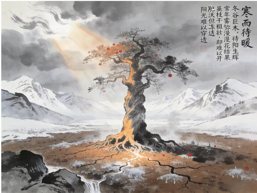 “冬谷巨木,待阳生辉”:一位身强但才华被 “封印” 的学员,画面如同一棵生长在冬季山谷的参天大树,枝干粗壮却因阳光(火)难以穿透雾气而无法开花结果。她的人生突破口在于引动和放大 “火” 的能量 —— 主动展现才华,投身互联网、文化传媒等火属性领域,用行动驱散内心的纠结与压抑。
