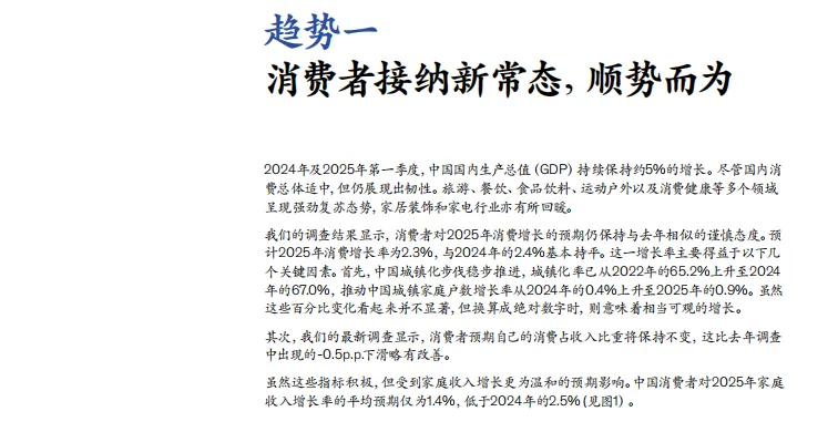 《2025年新常态下的中国消费报告》显示,中国消费市场呈个位数增长韧性,消费者信心趋于稳定。报告重点指出,消费者更注重个人成就实现,旅游、健康、教育等服务与体验消费增长突出。