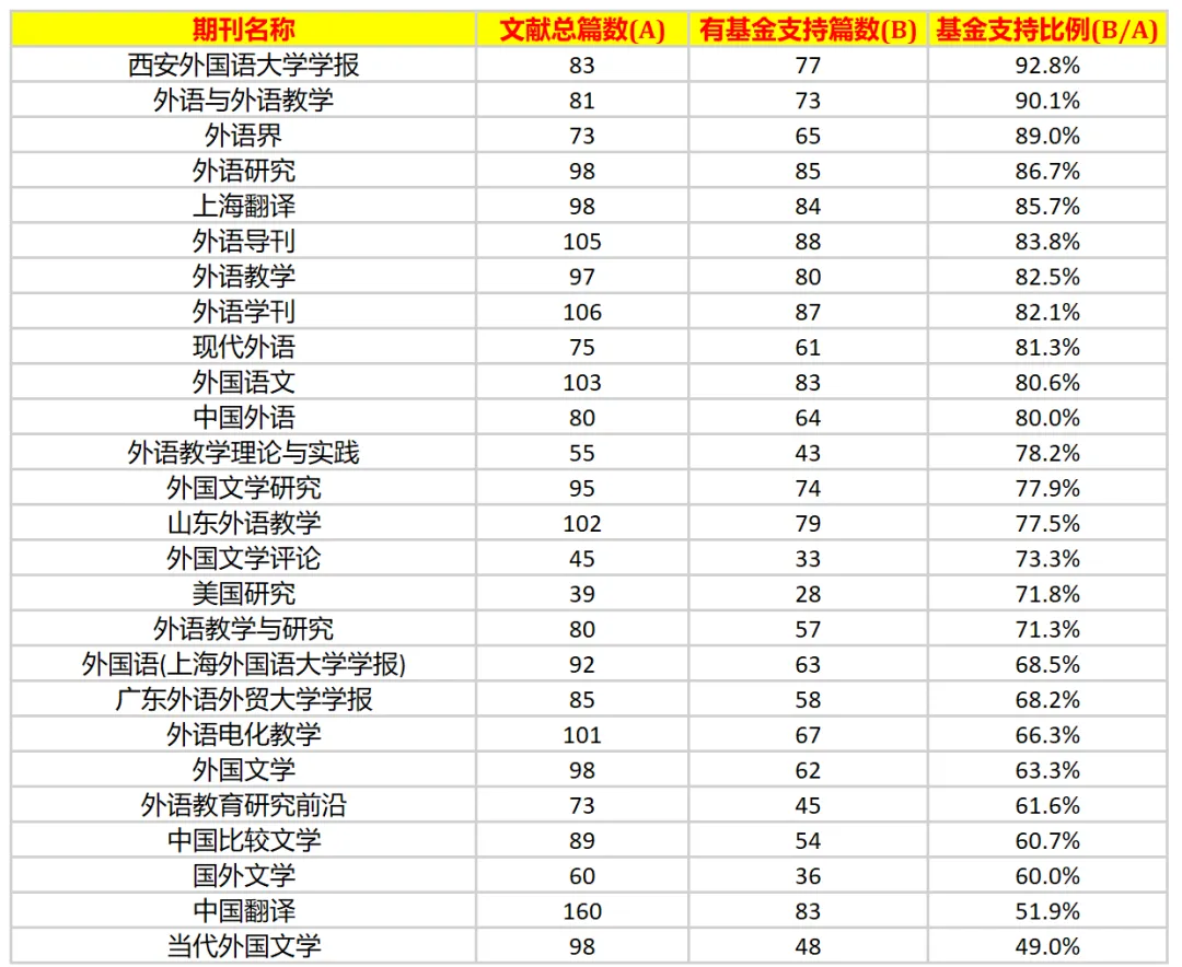 分析显示,基金资助比例最高的期刊为《西安外国语大学学报》,占比达92.8%;比例最低的为《当代外国文学》,占比为49%;全部期刊基金资助比例为73.8%。各期刊的具体基金支持情况如下: