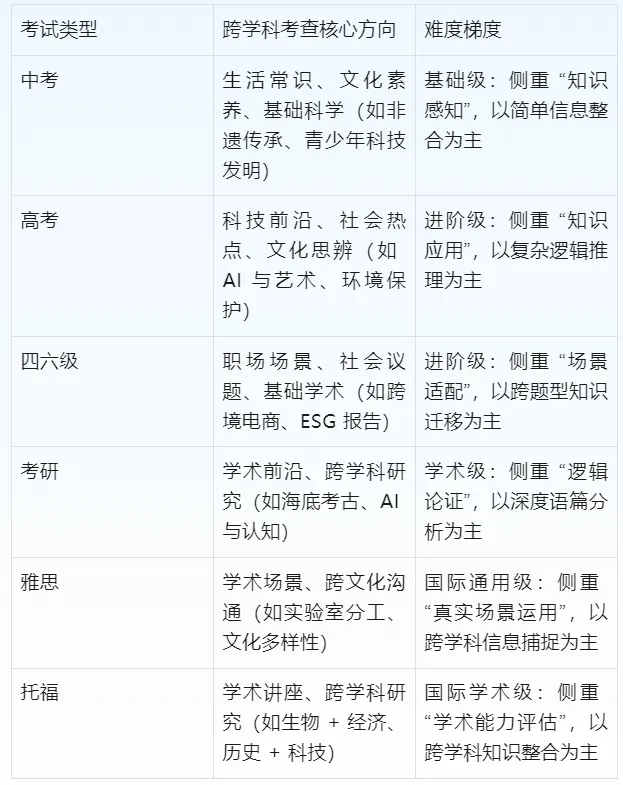 跨学科趋势不可逆转:2025 版新课标将跨学科主题学习纳入硬性要求,国内考试从 “知识拼接” 转向 “深度融合”,出国考试则以真实学术 / 生活场景实现跨学科考查。未来,跨学科语料的占比将进一步提升,考查形式将更加隐蔽。