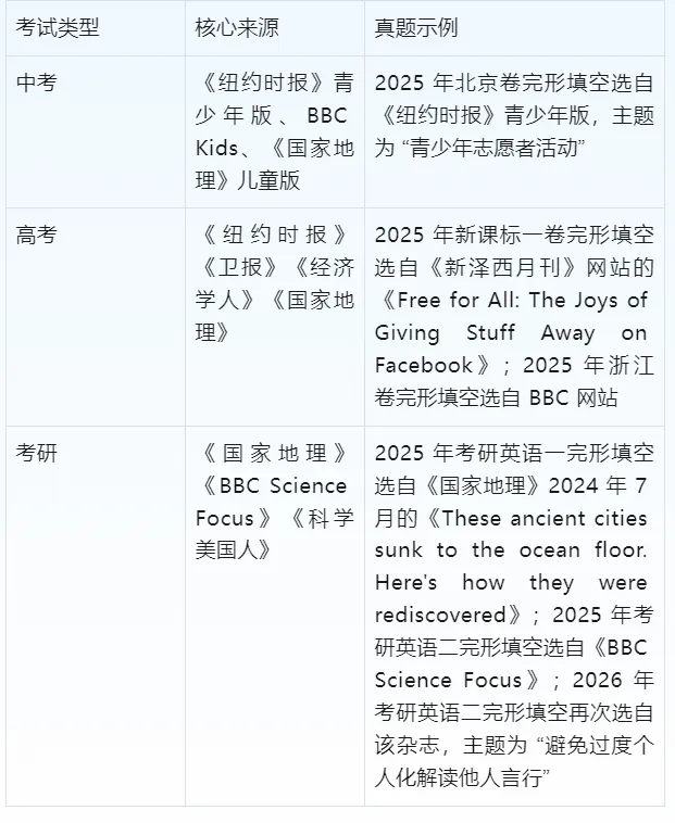 完形填空的语料来源直接决定了试题的难度与风格,不同考试的语料来源存在显著差异。