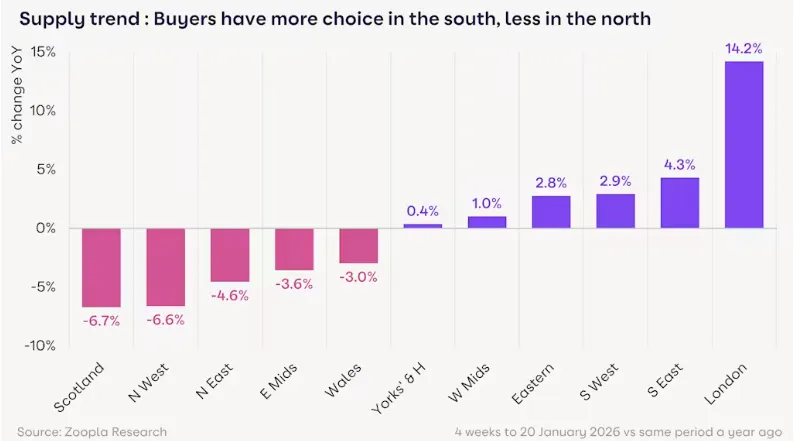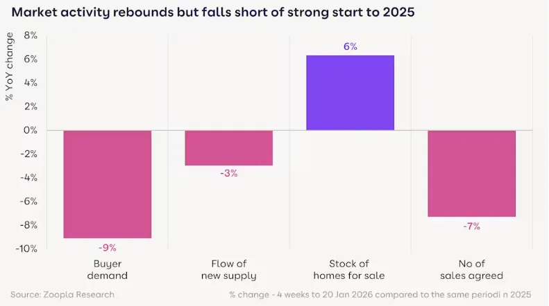2026年1月,英国房地产市场出现显著的季节性需求增长。2025年末,受秋季预算案不确定性影响,许多潜在购房者推迟了置业决策,而当前市场信心已全面回归,年初的购房需求与2024年同期持平。尽管较2025年初(购房者为赶在4月印花税减免政策结束前入市而掀起的购房热潮)低9%,但当前需求水平更具可持续性,反映出市场回归理性复苏轨道。