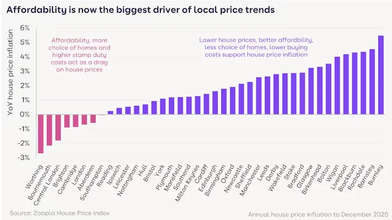 英格兰西北部的伯恩利年度房价涨幅高达5.5%,是全国平均水平的4倍多,罗奇代尔、布莱克本、利物浦和维冈等城镇的涨幅也均超过4%。这些地区的平均房价低于英格兰西北部205,400英镑的区域均值,凭借高性价比吸引了大量寻求物有所值的购房者,叠加抵押贷款利率改善和更宽松的贷款可负担性审核,需求持续攀升,推动房价上涨。