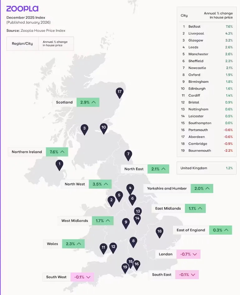 英格兰西北部紧随其后,年度涨幅达3.5%,苏格兰以2.9%的涨幅保持稳健增长;