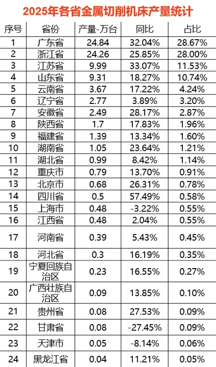 摘要:2025年金切机床产量86.8万台,同比增长9.7%,其中广东、浙江、江苏排名前三,根据公开报道,初步整理此文分享给业界同仁,整理不易,欢迎批评指正!