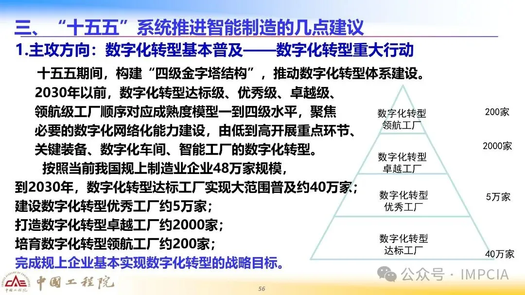 “十五五”期间,数字化转型体系建设将进一步深化,核心是构建“四级金字塔结构”。在2030年之前,数字化转型达标级、优秀级、卓越级、领航级工厂将分别对应成熟度模型一到四级水平,聚焦必要的数字化网络化能力建设,按“重点环节→关键装备→数字化车间→智能工厂”的路径由低到高推进数字化转型。