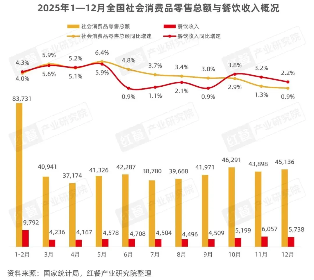 具体到第四季度,2025年第四季度餐饮收入为16,994亿元,在延续正增长的同时,增速有所放缓。国家统计局数据显示,2025年10月餐饮收入同比增长3.8%,11月和12月餐饮收入同比增速分别降至3.2%和2.2%。尽管季度内餐饮收入同比增速逐月回落,但整体仍高于同期全国社会消费品零售总额增速,显示餐饮消费在服务型消费中具备一定抗压韧性。