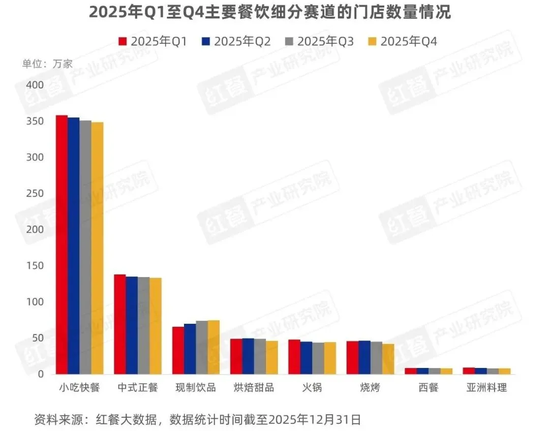 门店数方面,各细分赛道表现各不相同。红餐大数据显示,从主要细分赛道的门店数量来看,截至2025年第四季度,小吃快餐、中式正餐、现制饮品仍位列细分赛道门店数量前三,紧随其后的依次为烘焙甜品、火锅、烧烤、西餐和亚洲料理。
