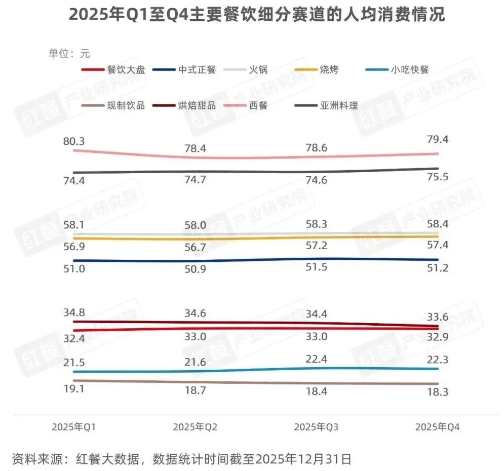 人均消费方面,红餐大数据显示,截至2025年第四季度,餐饮大盘人均消费为32.9元,整体处于相对稳定的区间。