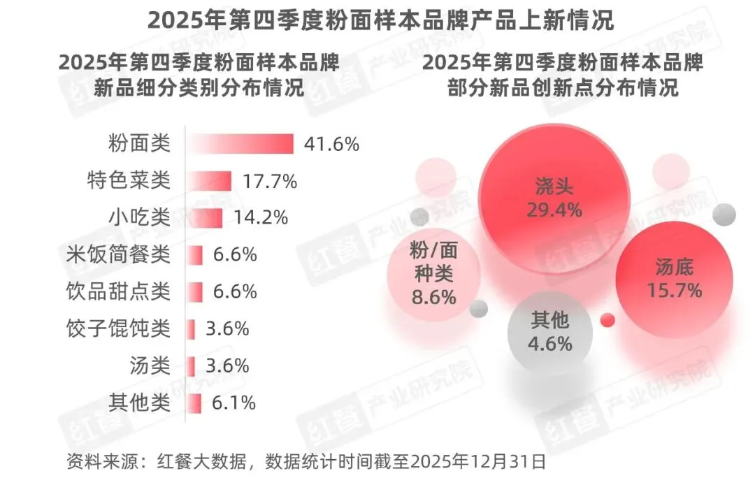2025年第四季度,红餐产业研究院监测的粉面样本品牌中,有34个品牌共推出了197款新品。从新品的细分类别来看,新品涵盖的类别有粉面类、特色菜类、小吃类、饮品甜点类、米饭简餐类等8种类别。