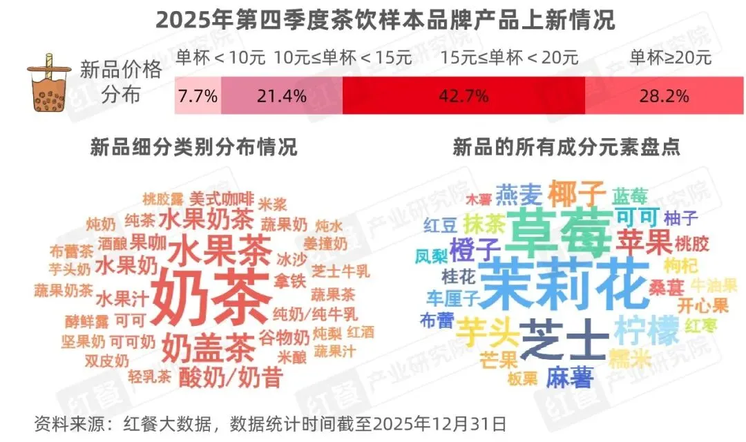 从现制饮品的细分类别来看,受冬季需求带动,奶茶在茶饮新品中的数量占比较上一季度明显提升并跃居第一,水果茶次之,奶盖茶紧随其后。与此同时,谷物奶、炖奶等品类也在新品中占有一定比例。