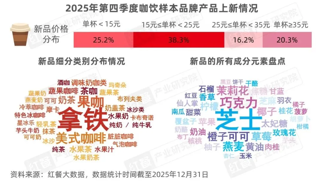 从价格分布来看,第四季度咖饮样本品牌的新品单杯价格主要集中在15元≤单杯<25元和单杯<15元这两个区间内,占比分别为38.3%和25.2%。