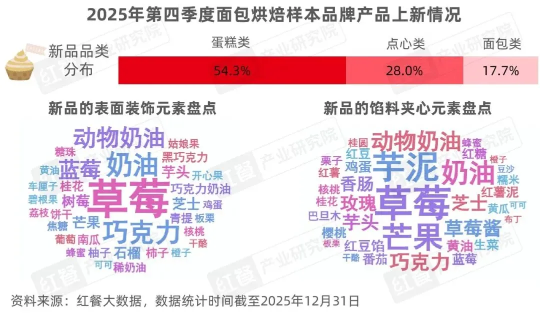 2025年第四季度,在红餐产业研究院监测的面包烘焙样本品牌中,有39个面包烘焙品牌共推出了784款新品。从面包烘焙新品的细分品类来看,蛋糕类的新品数量最多,共推出了424款,占新品总数的54.3%。