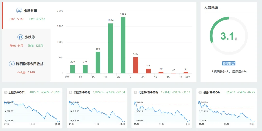 涨跌比接近 1:4,上涨个股不足千只,百股跌停、四千多家下跌的场景,已经好几个月没见过,市场情绪明显进入恐慌状态。