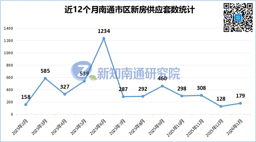 据「新知南通研究院」不完全统计,2026年1月,南通市区(包含崇川区、开发区、苏锡通园区)仅4个项目新获住宅销售许可证,新增供应179套,环比虽有一定上涨,但较2025年同期大幅下降约56%。